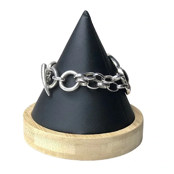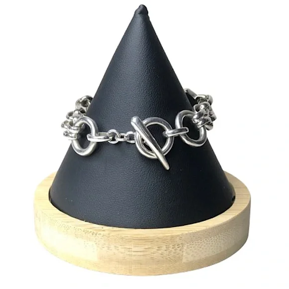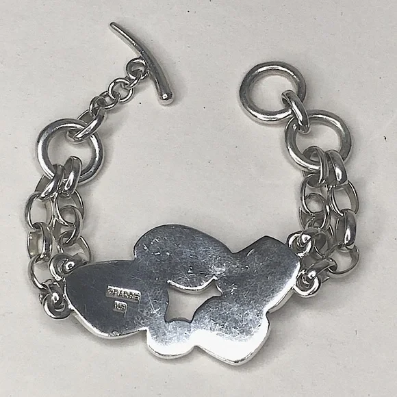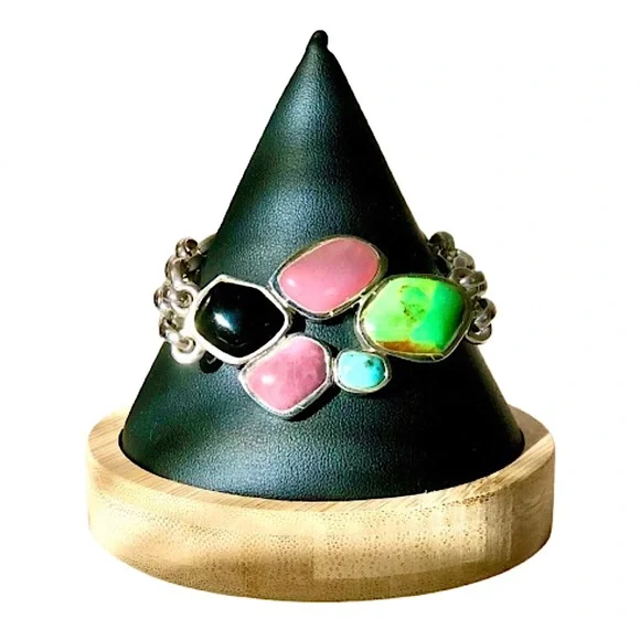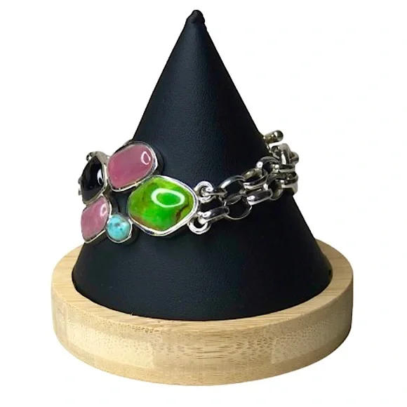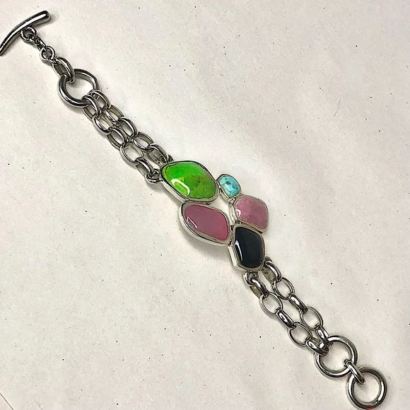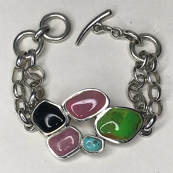 BARSE Sterling Silver Multi - Gemstone Double Stranded Rolo Toggle BraceletVintage Barse Sterling Silver ID Toggle BraceletDouble Strands of Rolo Links Combine From The Toggle Closure From Each Side To Support The Cabochon Stones Set in Silver On The FrontExcellent PreOwned ConditionFront Section Curved To Form To A Wrist - No Sizing or Bending Required*Photos of Measurements Are Available in The SlidesSince the Front Panel Curves, it Prevents A Complete Flat Measurement - The Photos Show An Approximate Measurement That Can Be Potentially Longer Than The Maximum Shown Due To The Curve. Toggle Closure Has Two Links For Adjustable SizingMarked: BARSE, 925Sterling Silver, Turquoise, Black Onyx, Lime Green Turquoise, Purple AgateColors May Vary Based on Shadows, Lighting, Monitor, Display Settings Ask Questions and/or Request Additional Photos, Measurements as Needed*Coordinating Barse Ring Shown For Accessorizing Purposes. Will Be Listed Soon