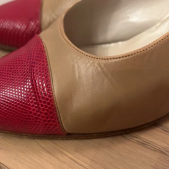 Vintage “Capretto" beige leather and red lizard, size 39 1/2 (heel height: 3 inches); comes with original box and dust bag (bag is stained)Good vintage condition, some scuffing on a heel side, creases, but lots of life leftPlease see pictures for details