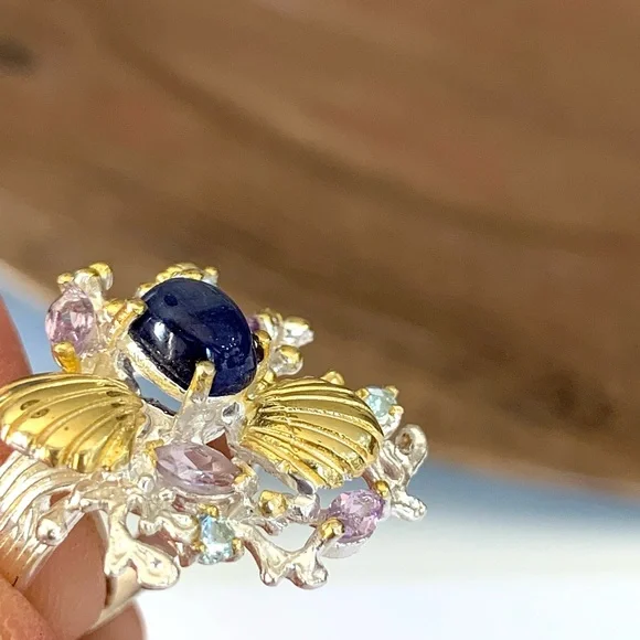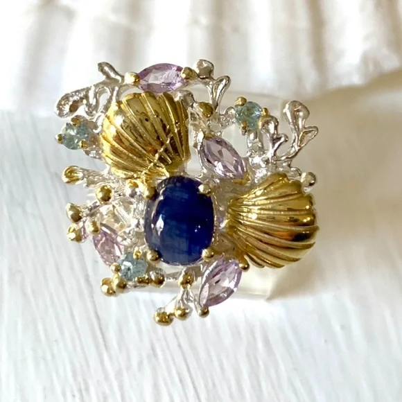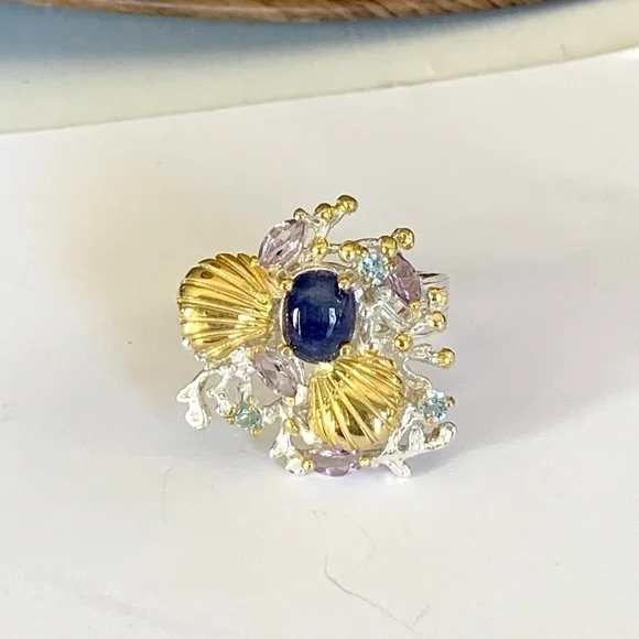 Artist custom designed gemstone ring from the Sea Life collection, featuring a cabochon cut blue sapphire stone. Set in solid sterling silver with 14 karat gold accents.Pastel pink Kuhnzite marquise cuts and light blue Topaz sparkle among the hand tooled scallops& coral. ** All natural gemstones Size: 7.75