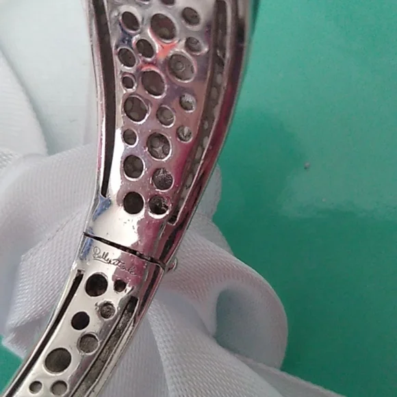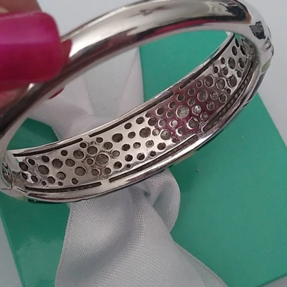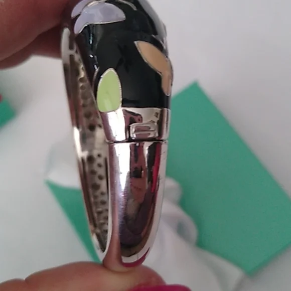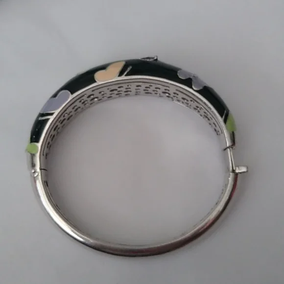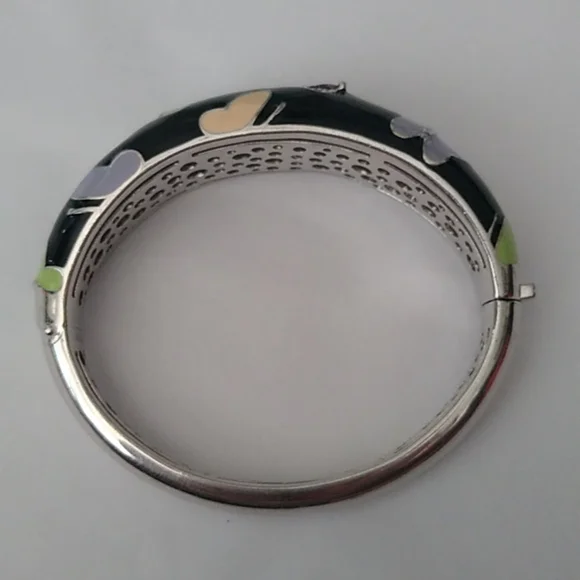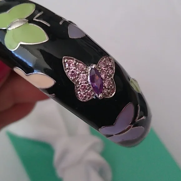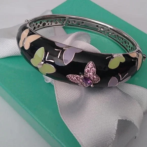Hand-painted black and multi-colored Italian enamels with pink and amethyst stones set into rhodium-plated, nickel allergy-free, 925 sterling silver. MeasurementsInside opening is 2.25" across x 2.0 high.The hinge opens a full 1.5"Weighs 44.83gIn French, Belle Étoile means beautiful star. That is why a delightful radiance permeates throughout all their creations. Designed to reflect the latest European fashion trends, the dazzling selection of exquisite jewelry enhances the lifestyle of the modern woman. Belle Étoile adheres to the philosophy of combining natural beauty and grace with the marriage of high-quality craftsmanship and outstanding designs to give you the fun, beauty, and excellence that you expect from Belle Étoile.Comes boxed with a bow.