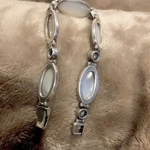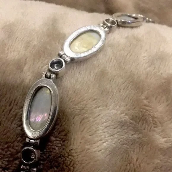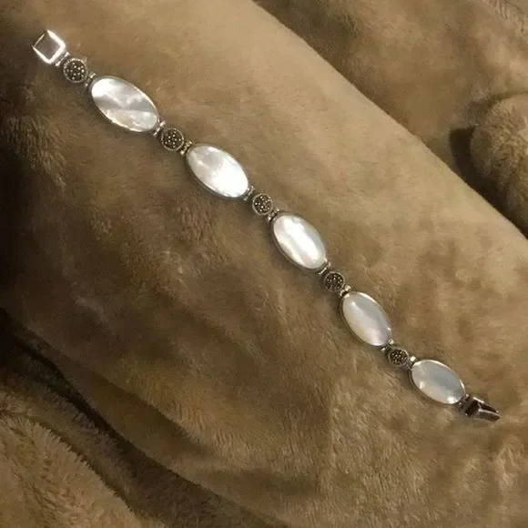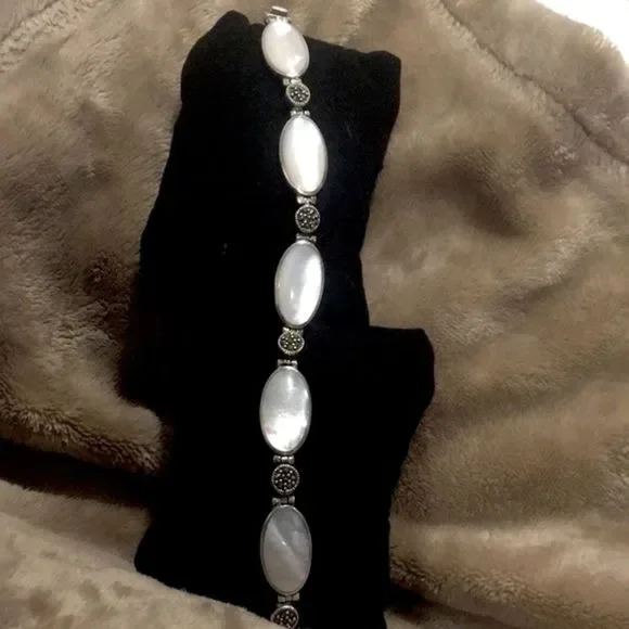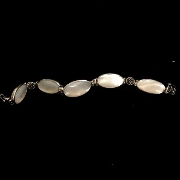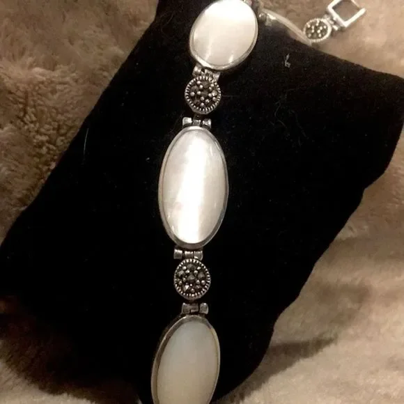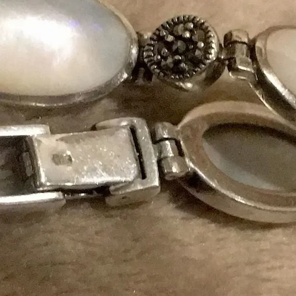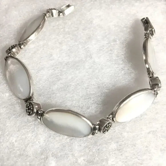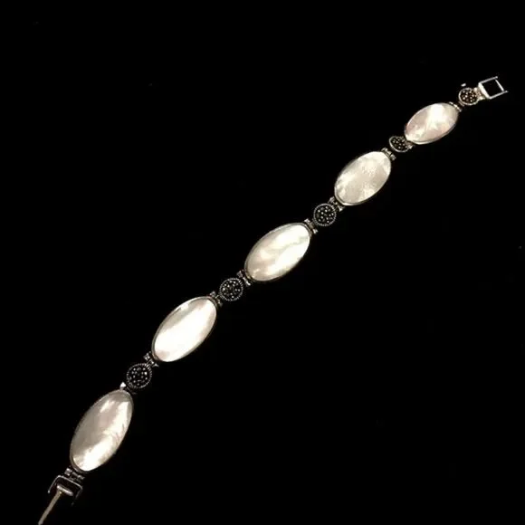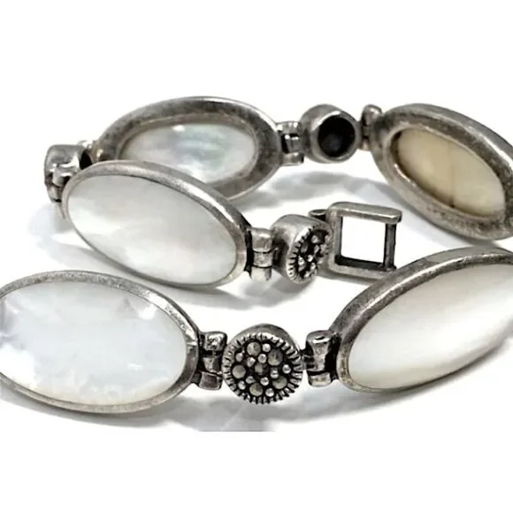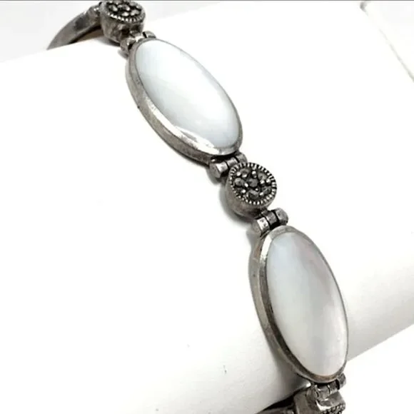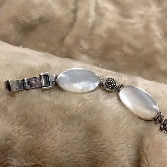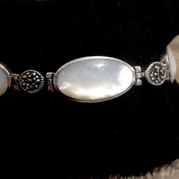 Vintage Mother of Pearl Marcasite Sterling Silver BraceletSterling SilverMother of PearlMarcasiteMarked: 925Approximately 7-1/4” 22.4gPlease Use Provided Silver Polishing Cloth To Care For Your Jewelry. Mother of Pearl is Porous and Can Be Ruined By Chemicals and Sterling Silver Cleaners. The Original Oxidized & Marcasite Stations Between Each Cabochon MOP is Intentional and Can Be Ruined if Treated Improperly.Color May Vary Based on Shadows, Lighting, Monitor, Display SettingsAsk Questions and/or Request Additional Photos, Measurements as Needed$325