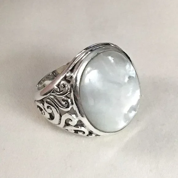 Vintage Sterling Silver and Mother of Pearl RingSize: 7.5Sterling Silver BandBeautiful Filigree On The SoundsStamped 925Round MoP Mother Of Pearl Cabochon Gem StoneAsk Questions...
