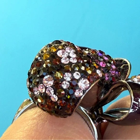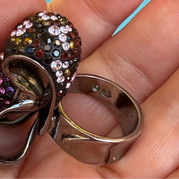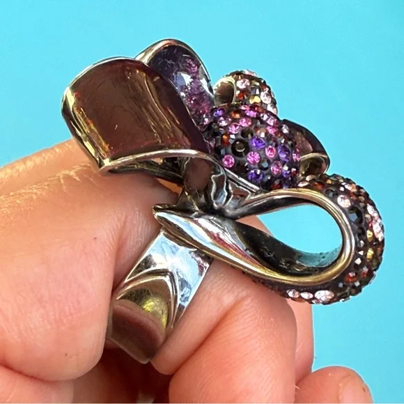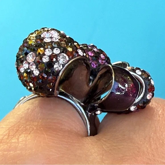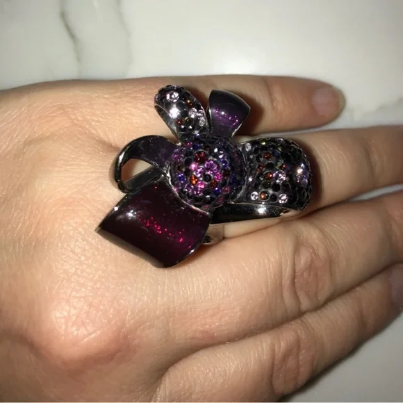This exquisite Swarovski ring showcases a harmonious blend of purple and black tones, embellished with shimmering crystals for a captivating sparkle. Its sophisticated design and striking color palette make it a perfect addition to any jewelry collection, adding a touch of elegance to any outfit.Size 6.5No missingcrystals No box