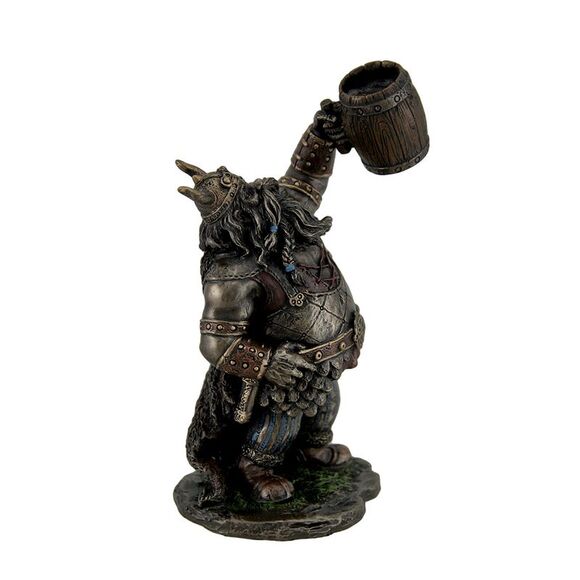 Norse lore tells that Viking warriors fought hard, and partied even harder. This wonderful statue depicts a Viking warrior toasting his brothers who have gone to Valhalla. Made of cold-cast resin, the figure measures 7 inches tall, 4 inches long, and 3.5 inches wide. His metallic bronze finish is hand-accented with red and green enamels. He´ll make a great gift for Viking enthusiasts.
