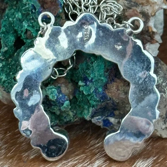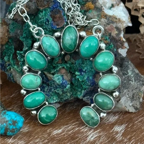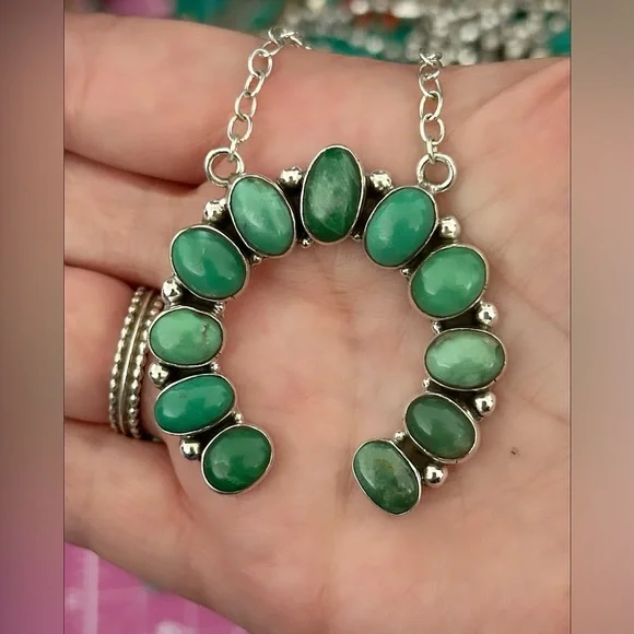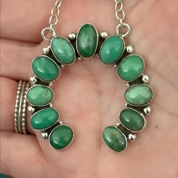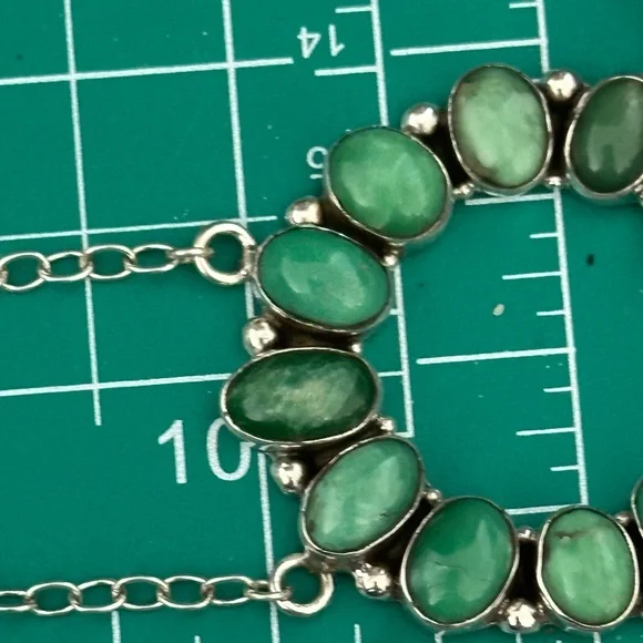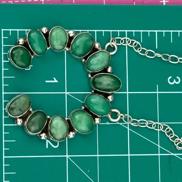 Naja measures approximately 1.75 inches. That gorgeous green. Not to be confused with turquoise but use just the same and various Navajo jewelry pieces. Guaranteed 925 sterling silver.  the necklace wearable length is approximately 20 inches but you can shorten this. The links are available there to put the S hook through to make it shorter. New #.