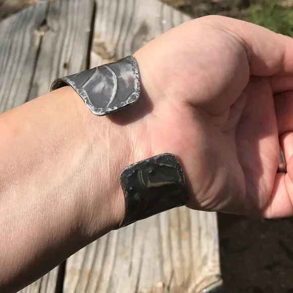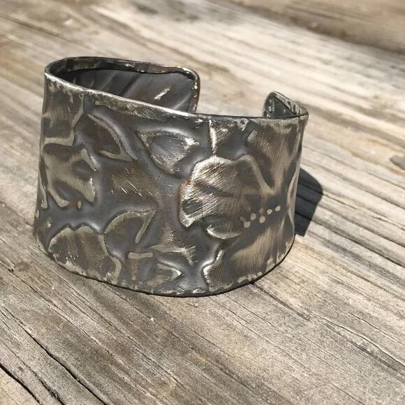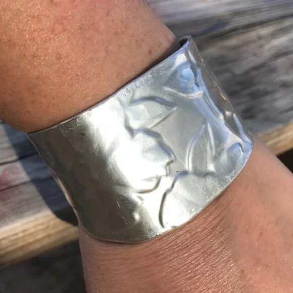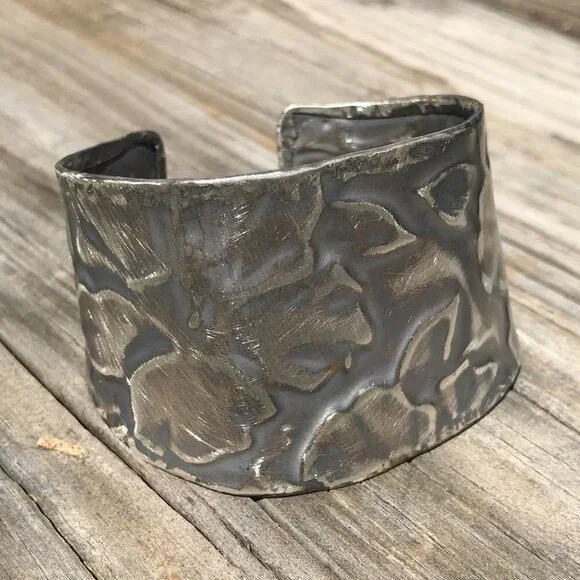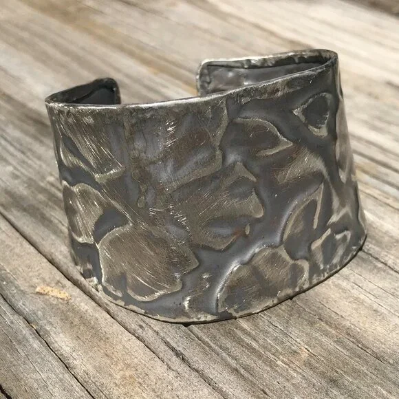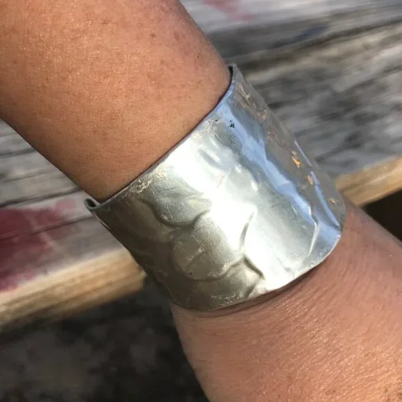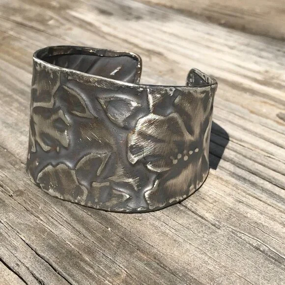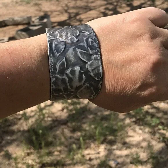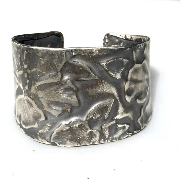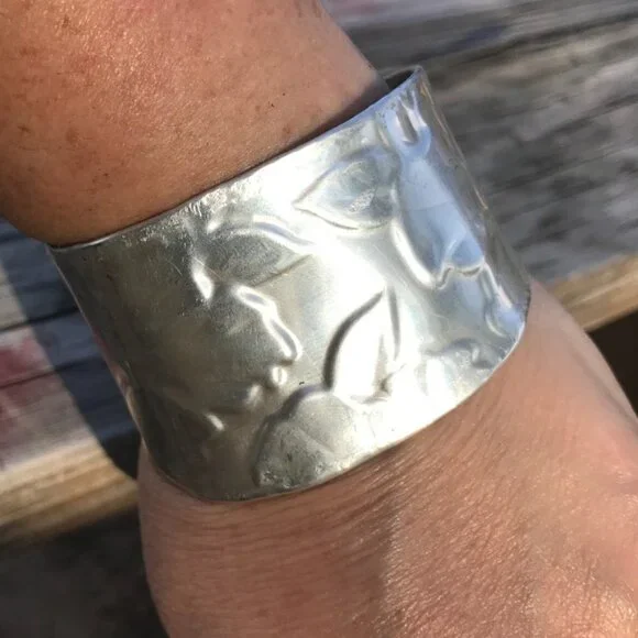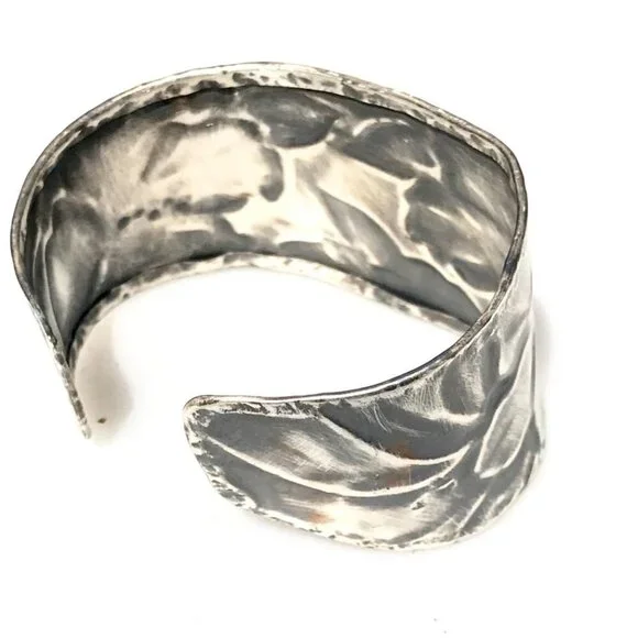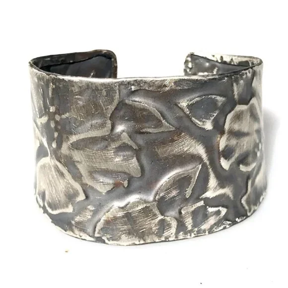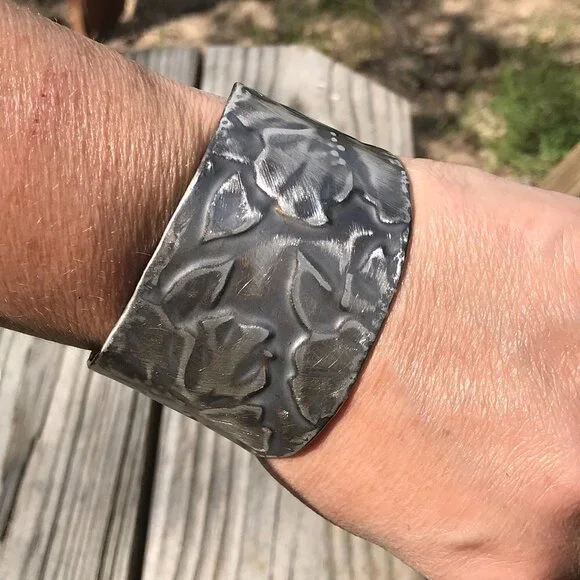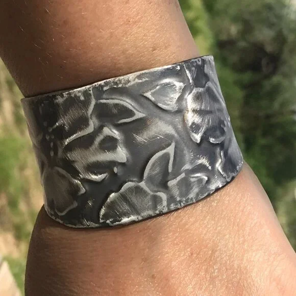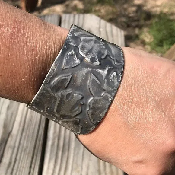 Thank you for looking at this handmade one of a kind newly designed embossed cuff bracelet. This cuff is solid sterling silver.About 41 gramsalmost 2 inches wideThis cuff is slightly adjustable, will fit medium to large wrists 6.5-7 .5 wrists*I can make more in the future, allow for slight differencesI will be able to make your size as well, even if it is petite or 2xlhandmade hand forged, Rustic, handcrafted24 GaugeWith or without patina. Request patina (patina photos coming soon).solid sterling silver , 925, made from new silverI will be buying a stamp soon , thank you for supporting my business