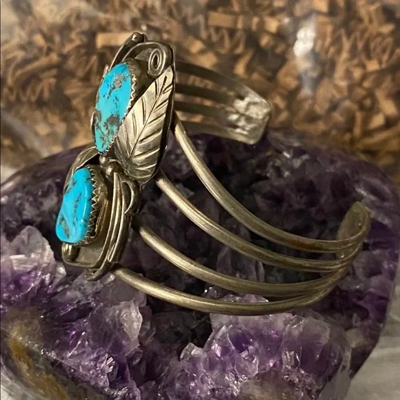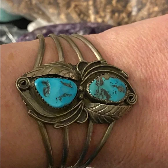 Great patina . Beautiful turquoise stones! Guarantee 925 Sterling silver tested.Vintage two stone turquoise beautiful chunk in a beautiful leaf setting. There is nothing like...
