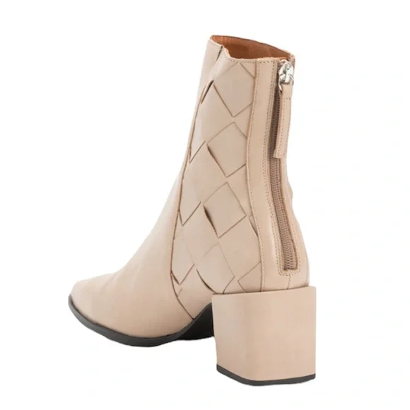 Brand NewWoven detail, block heel, grained finish, size chart conversion may vary slightly by country2.25in. heel7in. shaft height, 11in. shaft circumference, taken from size 39Square toe, back zip closureLeather upper, man made soleImported, made in Spain