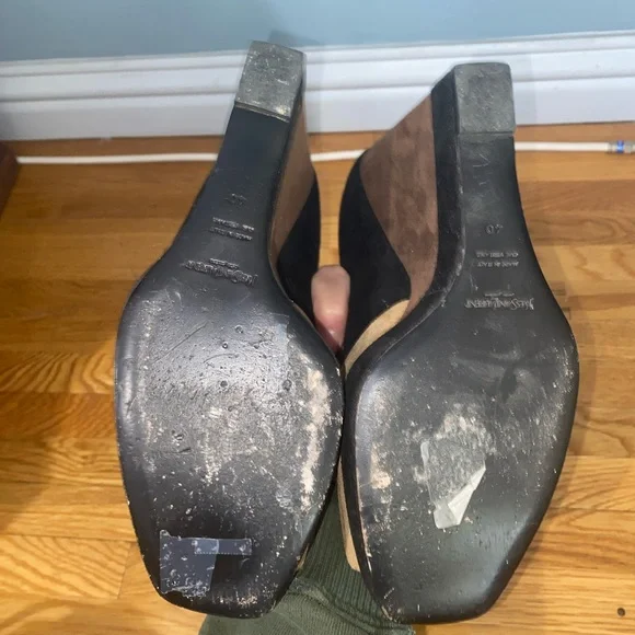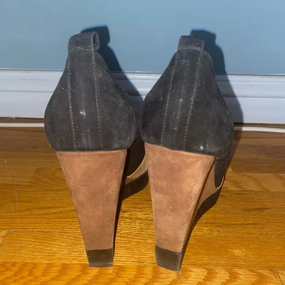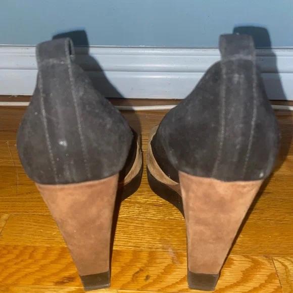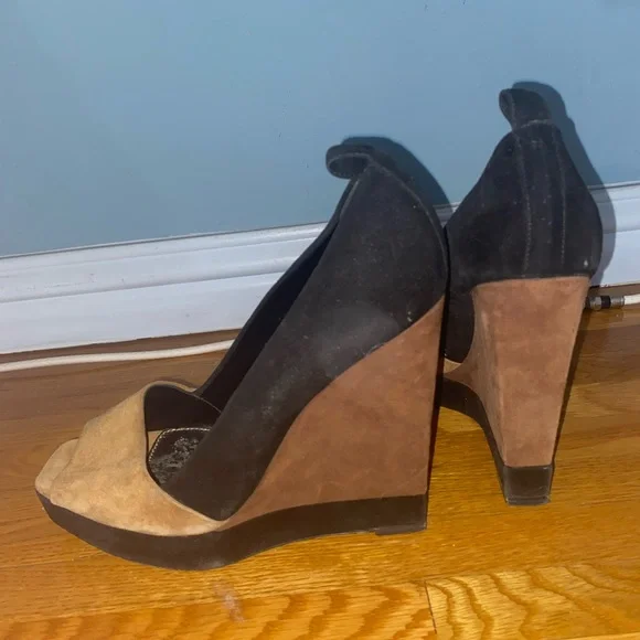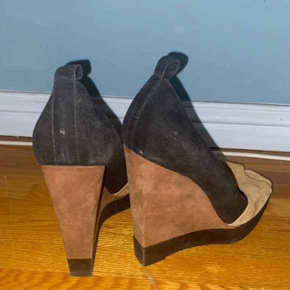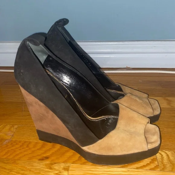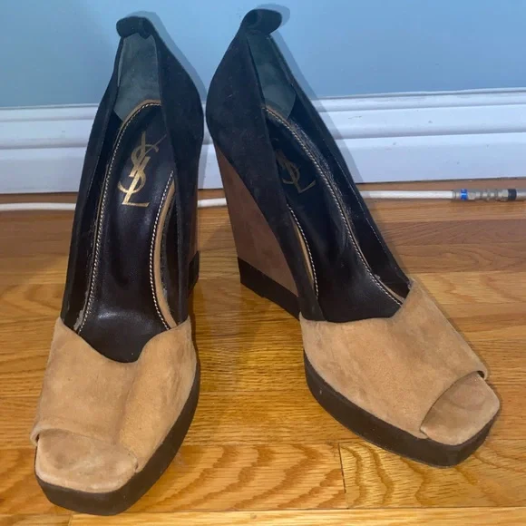 Vintage YSL suede colorblock tan and black square peep toe super high wedge heels (has loops for ankle straps, but the straps are missing. Still looks cute as is or you can put...