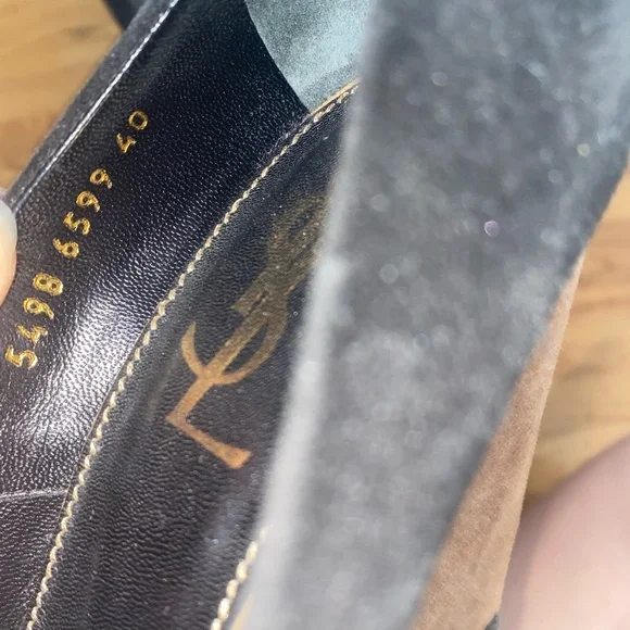 Vintage YSL suede colorblock tan and black square peep toe super high wedge heels (has loops for ankle straps, but the straps are missing. Still looks cute as is or you can put ribbons or anklets through the loops, or just cut the loops off. Size 40. Some marks on the suede and signs of wear on the bottom but overall great condition!
