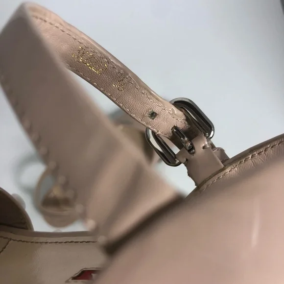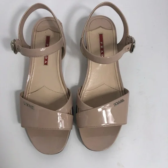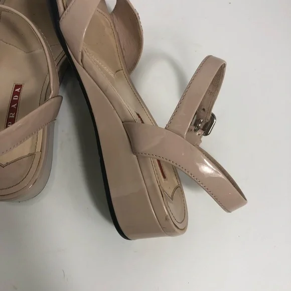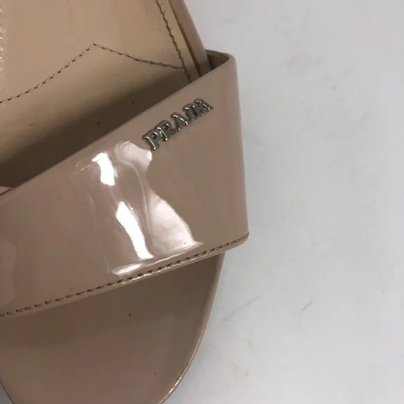 Prada | Patent Leather Open Toe Wedge Sandals~36Great Condition Minor Signs of WearFew ScuffsNudeSize: 36Patent LeatherAdjustable StrapsPrada Logo100% Authentic