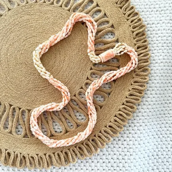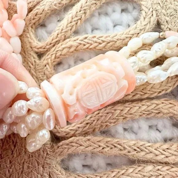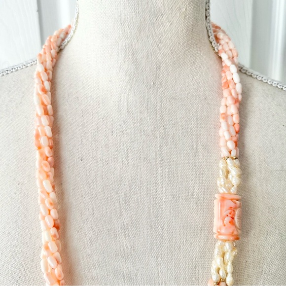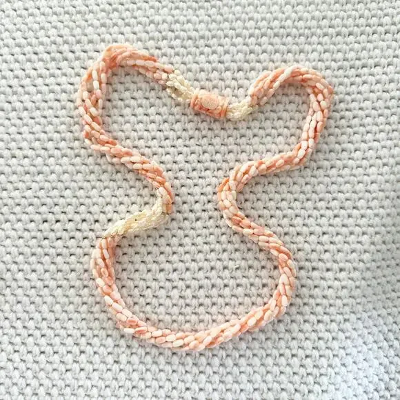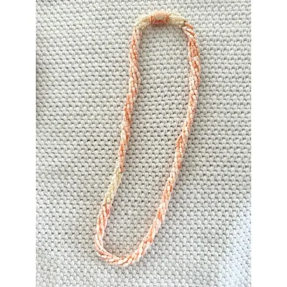 Vintage. 33" total length. Angel hair coral multi twisted strand beaded necklace. Carved pink white coral bead. Gold accent beading. Preowned in good condition with no stains or tears.Measurements: approximate15" drop or 33" total length All items come from a smoke free/pet free home. No trades or modeling. As always, offers are welcome. Thanks for stopping by!