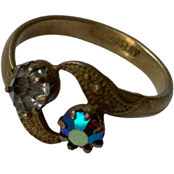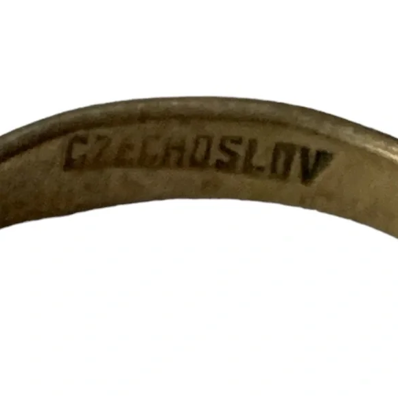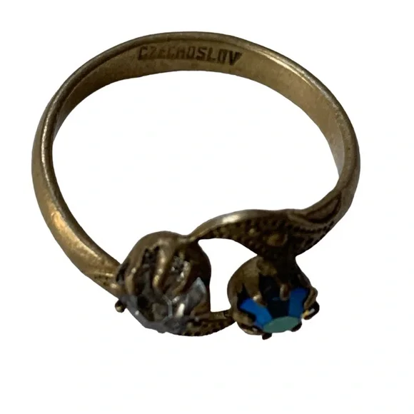 Antique, please see photos for the condition.Marked:Czechoslov This ring is stunning! And rare.It has a art nouveau design Two beautiful Swarovski crystals The metal appears to be brass.Czechoslovak jewelry, was made so well with beautiful workmanship.