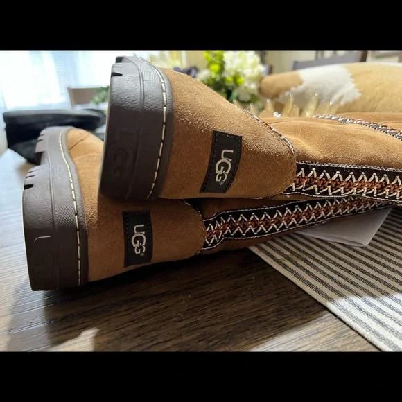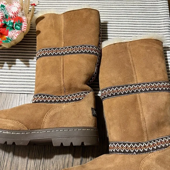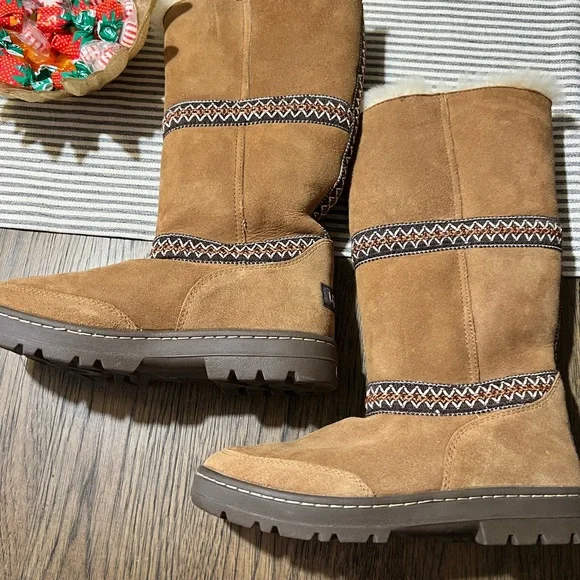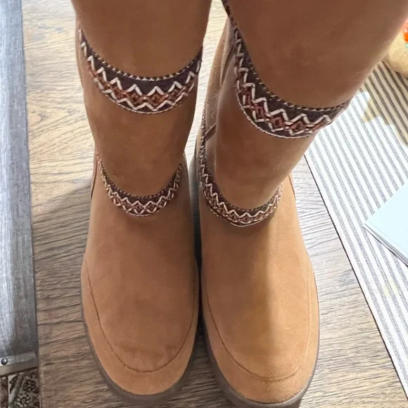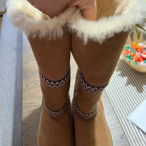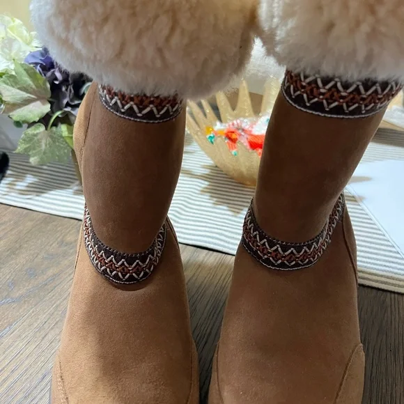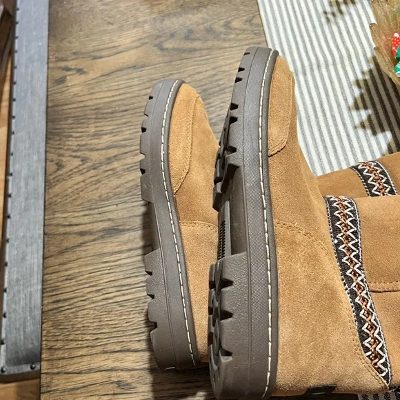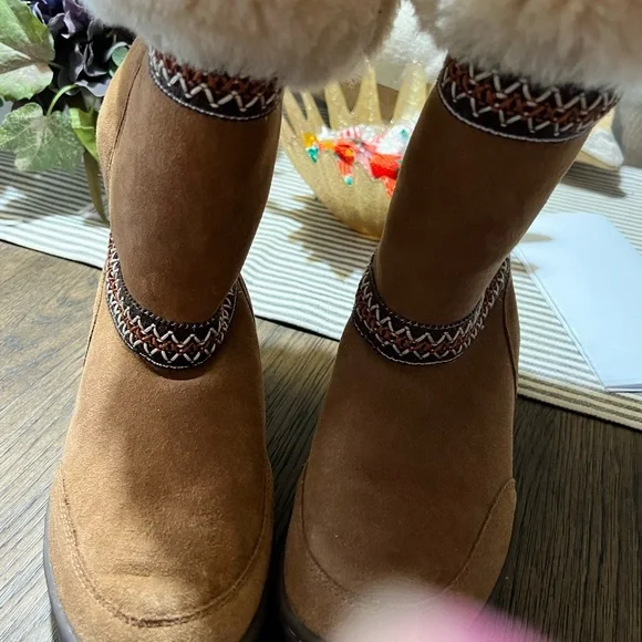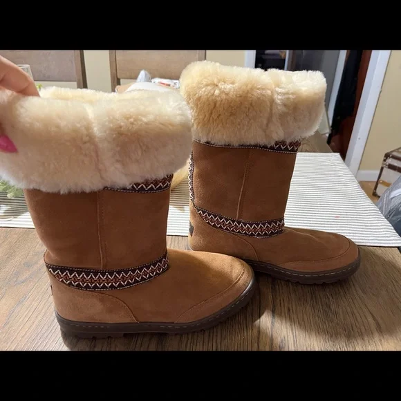 These are the heavier version. With a slightly higher platform super cute and warm with details and accent. In like new condition. I wear 8.5 and they fit fine