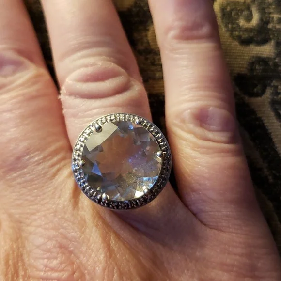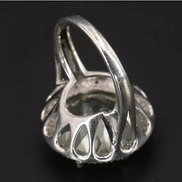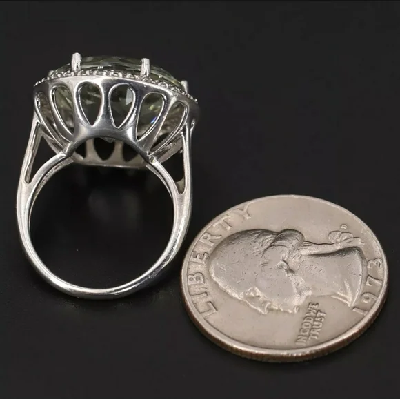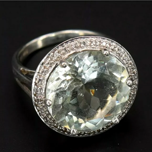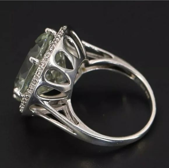 This stunning vintage statement ring is extraordinarily rare and highly sought after! It features a large precisely faceted and sparkling authentic Prasiolite gemstone set in a pure .925 sterling silver carriage and designer signed band! Weighs 6 grams! EUC! Hurry on this one! Other listingswomens rings 925 sterling silver gold rose gold platinum authentic genuine gemstones gemstone anniversary promise engagement birthday birthstone moissanite ruby garnet sapphire paraiba tourmaline peacock quartz peridot opal ethiopian welo opal amethyst diamond aquamarine apatite morganite topaz emerald jade goshenite shungite rare sleeping beauty turquoise alexandrite tanzanite D´joy Zales Clyde Duneier Michael Valitutti Victoria Wieck Kabana Colleen Lopez Tacori gift gifts gift ideasAll sales final!