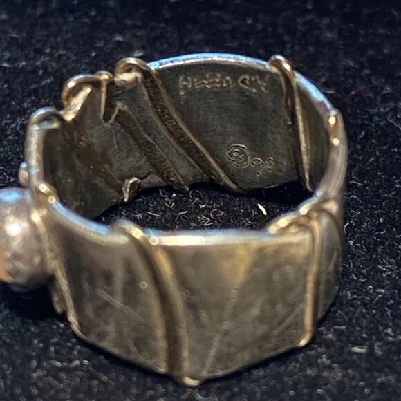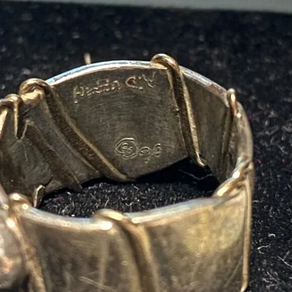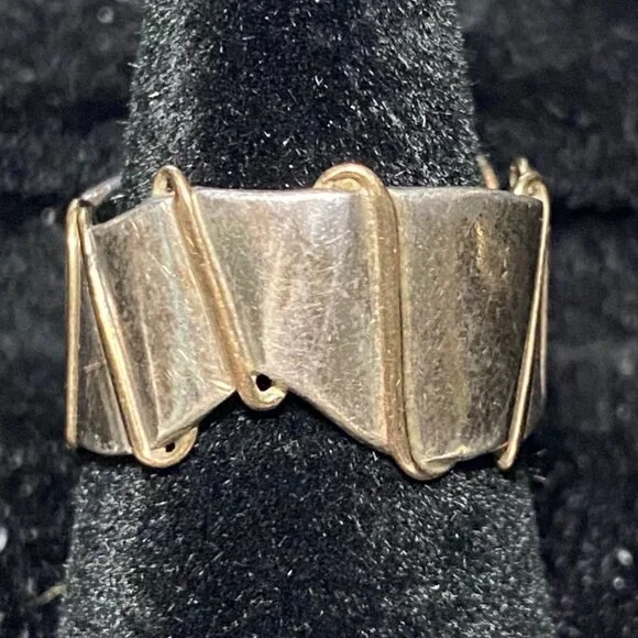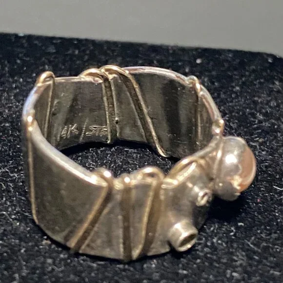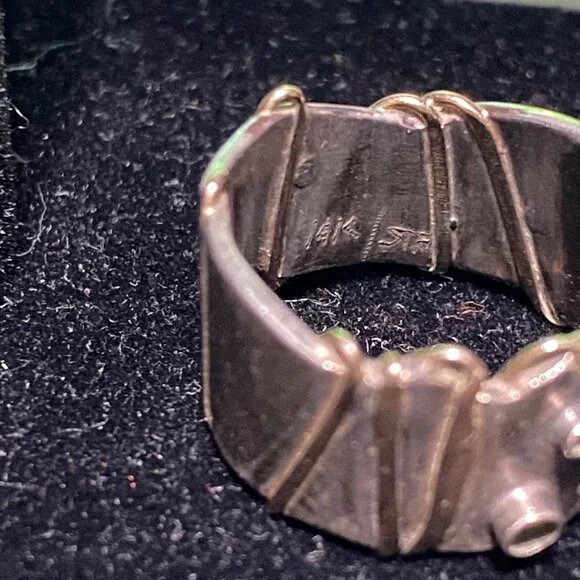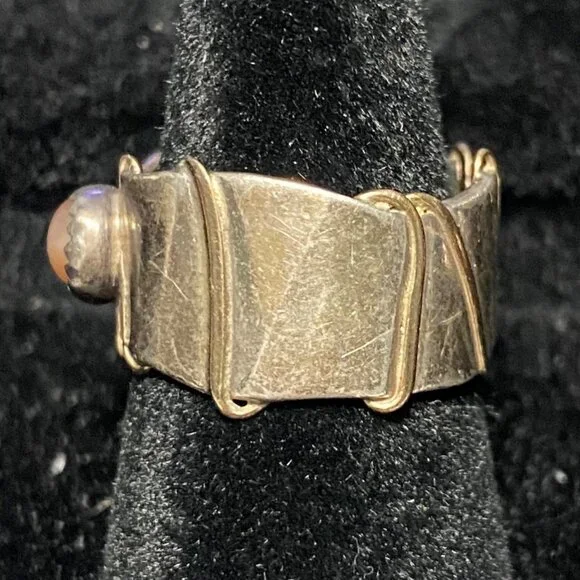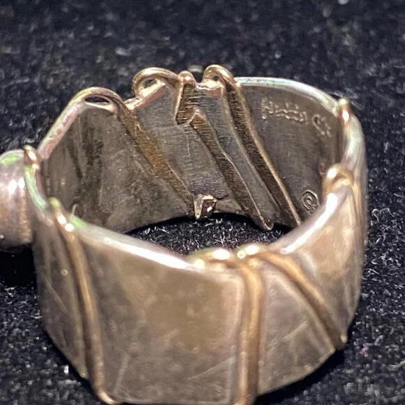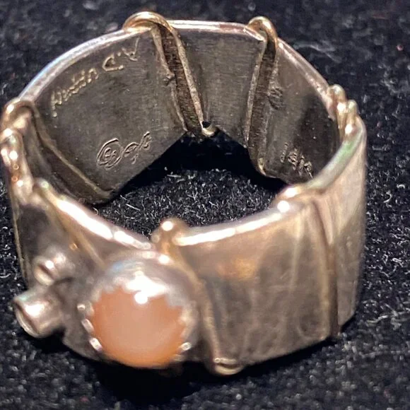 This vintage Angela Duffin sterling silver ring, possibly Ethiopian opal, features alluring gold accents. Size 5 and weighing 6 grams, it´s a piece of 90´s elegance with...