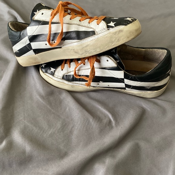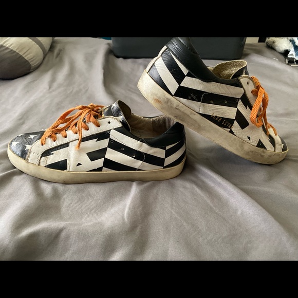 Selling these cool looking golden goose!Used for quite times, but they’re not all. These are supposed to look like old shoes. A small scratch in the front of the shoe, but not a big deal. If fits like a 7 or 7.5for men and 9 for women . These are unisex. I take questions and offers!
