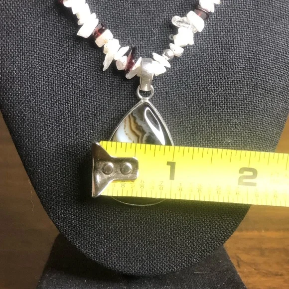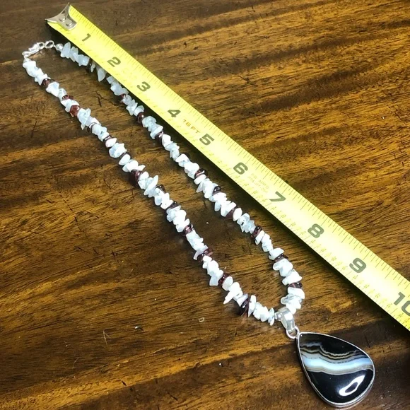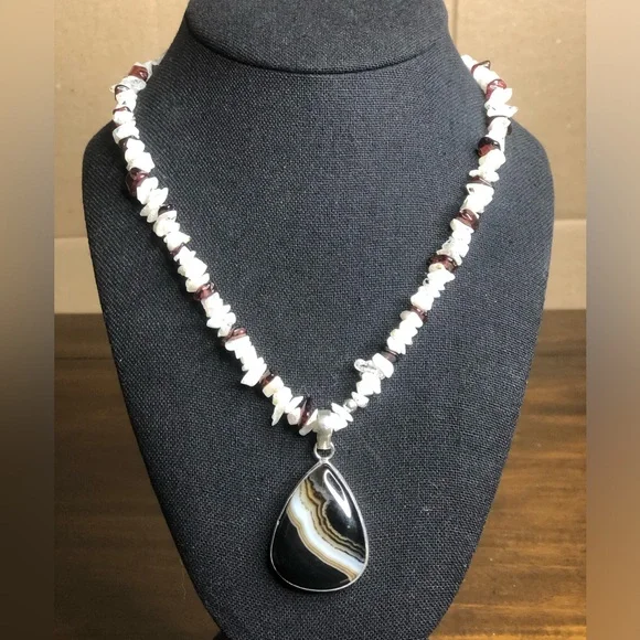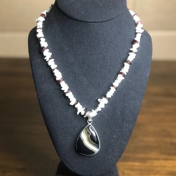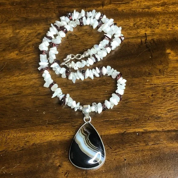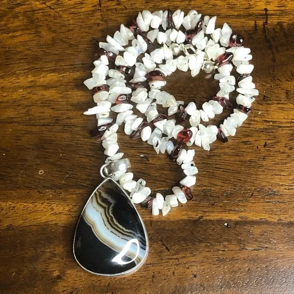 Sterling Silver Old Southwest Striated Onyx Cabochon Garnet Moonstone Chips 925 NecklaceOld Southwest Striated Cabochon Onyx Tear Drop Shaped Gem Stones Restrung Into Modern Sterling Silver Chip Necklace*Old Southwest Cabochon Striated Onyx Cabochon Gem Stone Pendant and Moonstone, Garnet Chip Necklace Pieces That Were Restyled Into A Modern NecklaceThe Original Native Pieces Degraded So Much That The Stones Were Salvaged And ReHomed Into A Similar Type Jewelry Piece From That Which They Came From.Best Of Both Worlds- When Preservation Was Untenable In Their Original Setting, New Settings (Close In Style To What Was Original Housing The Gems), Now Support The Original Southwest Native Gems$325Ask Questions and/or Request Additional Photos, Measurements as NeededColors May Vary Based On Shadows, Lighting, Monitor, Display SettingPhotos of Measurements Are Available In The SlidesAs These Are Both Brand New and Antique Pieces, You May Find Markings and Signs Associated With The Vintage Jewelry.Please Review The Pieces For Current Condition and Signs of Wear Associated With It’s Previous Life.Black White Burgundy Necklace