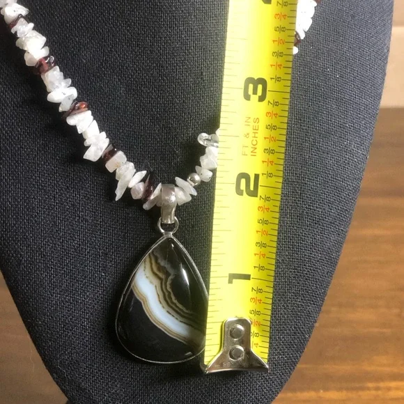 Sterling Silver Old Southwest Striated Onyx Cabochon Garnet Moonstone Chips 925 NecklaceOld Southwest Striated Cabochon Onyx Tear Drop Shaped Gem Stones Restrung Into Modern...