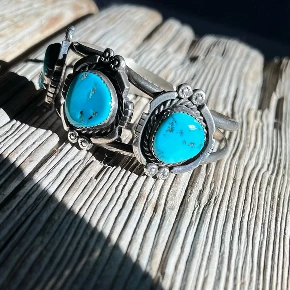 Gorgeous, handmade, authenticVintage Navajo Turquoise Sterling Silver Cuff, 3 stonesMarked by Artist:“Irene BegayThoreau, NMSterlingNavajo”Inside circumference with gap 6 9/16”Gap is 11/16”3 stones are all in the range of 1/2”Most photos taken in bright sunlight. Last 2 photos taken indoors at night under a lightbulb. # Southwest, Native American jewelry, New Mexico, Arizona