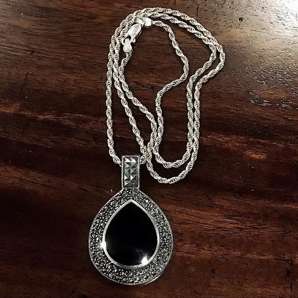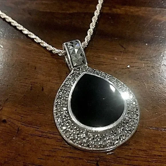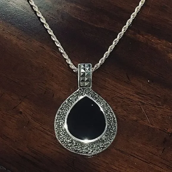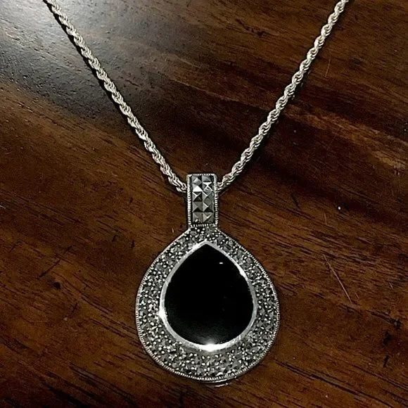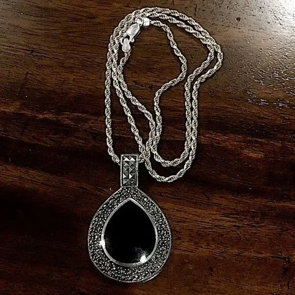 Vintage Sterling Silver Onyx and Marcasite NecklacePendant: Teardrop ShapedSterling Silver,Onyx, MarcasiteStamped 925Necklace: Sterling Silver, Lobster Claw Clasp, 20 inch lengthStamped 925, Italy, PDGASmoke Free HomeAsk Questions and/or Request Additional Photos, Measurements as NeededColor May Vary Based On Shadows, Lighting, Monitor, Display Settings$325
