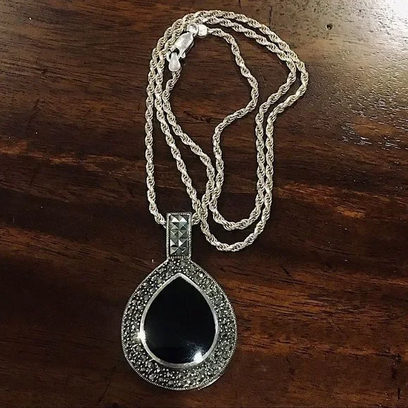 Vintage Sterling Silver Onyx and Marcasite NecklacePendant: Teardrop ShapedSterling Silver,Onyx, MarcasiteStamped 925Necklace: Sterling Silver, Lobster Claw Clasp, 20 inch...