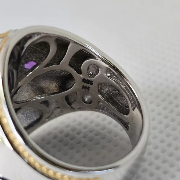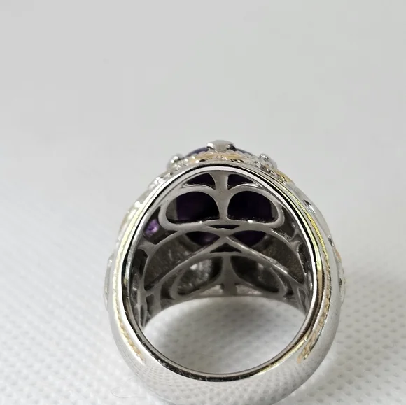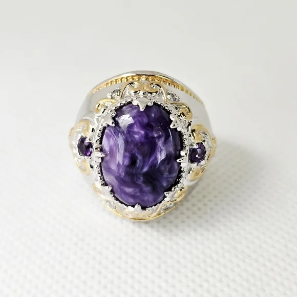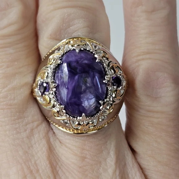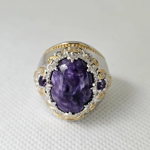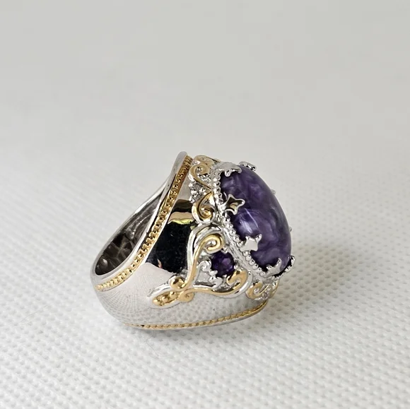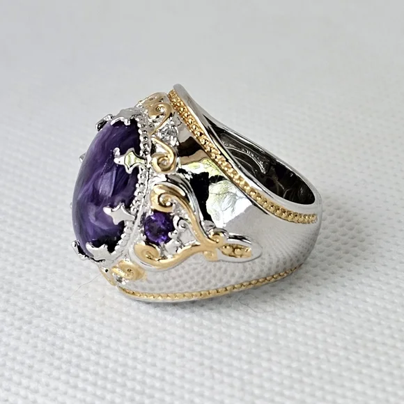 Genuine Charoite & Amethyst Ring Palladium Sterling Silver 18k YG Size 6.5!
