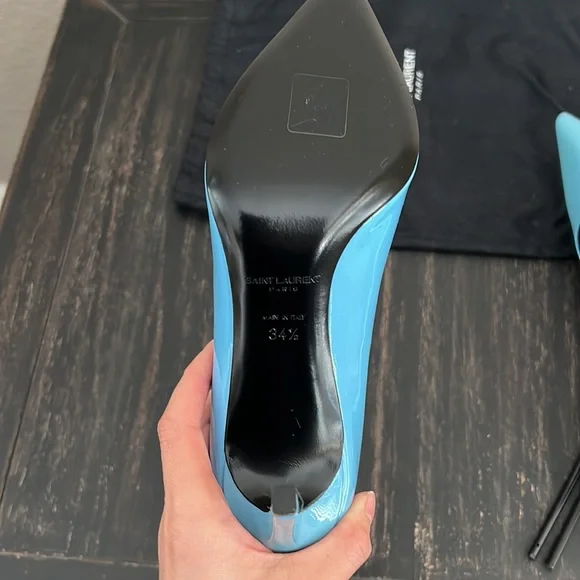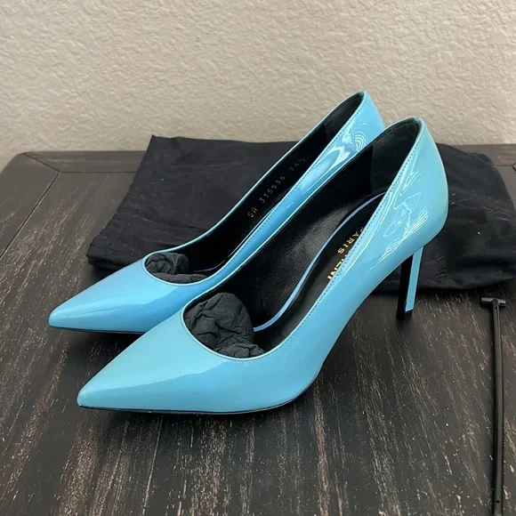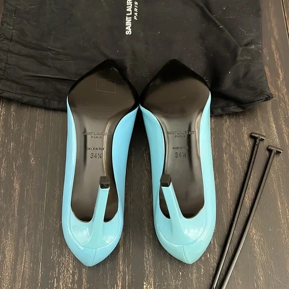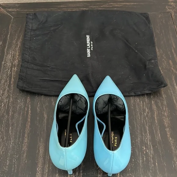 Yves Saint Laurent glam high heelsNew never worn, with original dust bag and shoe holdersBaby blue shining leather3” HeelsSize 34.5