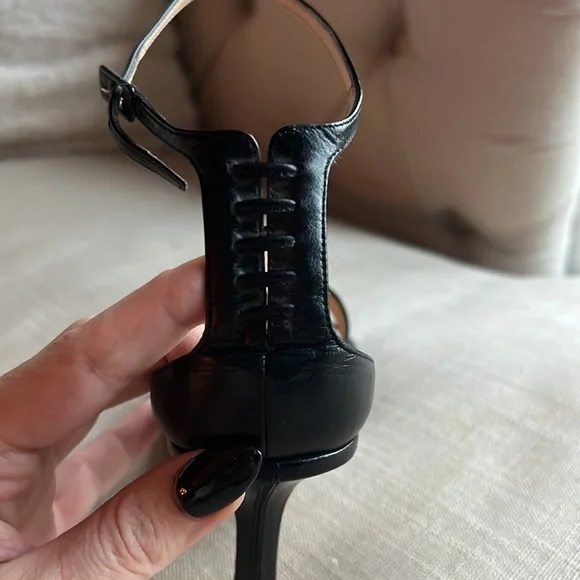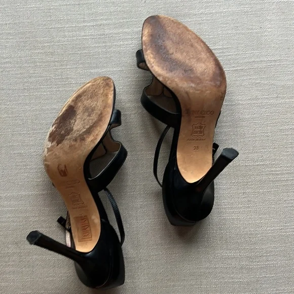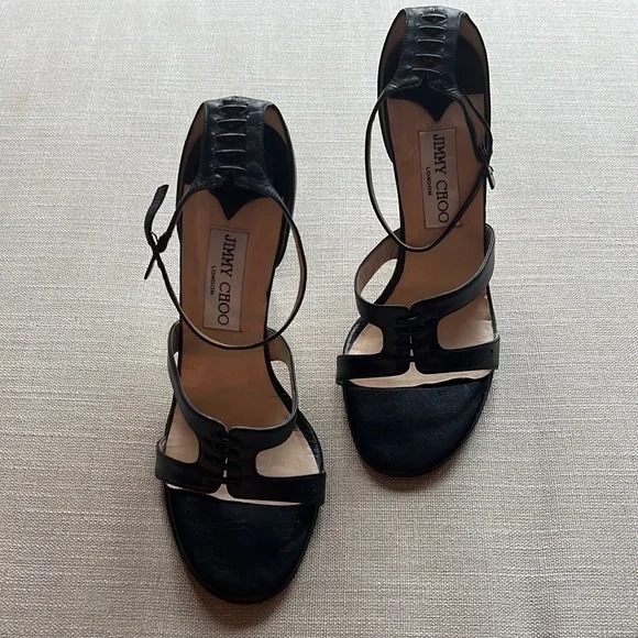 VINTAGE - IMPOSSIBLE TO FIND!!!!!! JIMMY CHOO BLACK LEATHER SANDAL HEELS WITH ANKLE STRAP, SIZE 38, WEAR IS MOSTLY JUST ON THE SOLES