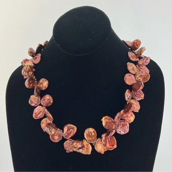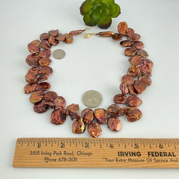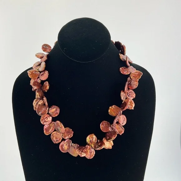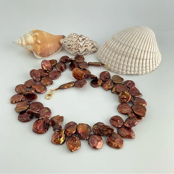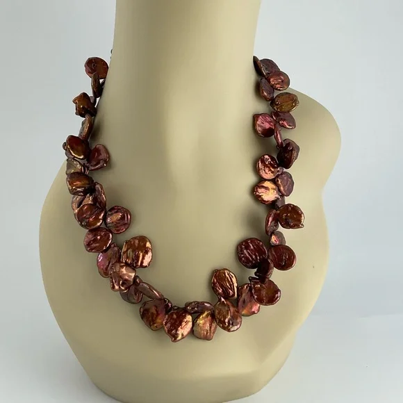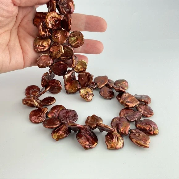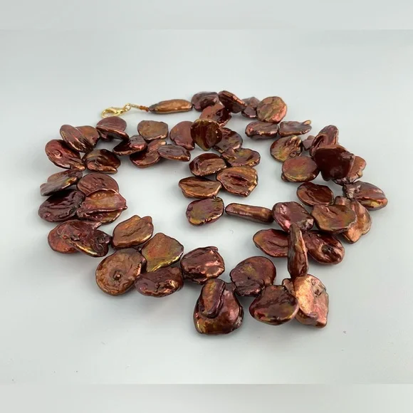 Handmade.Amazing Copper Color Keishi Pearl Necklace with a Golden Luster.This is a Chunky Coin Pearl Necklace, Artsy, Playful and Fun.For the person "Who has Everything!"Coin pearls are round and flat.These pearls are designed to have movement.The Keishi stick pearls and seed beads at the ends of the strand are for comfortable wear and ease of use.Unique Gift.One Available.Brand; handmade by seller.Gemstone;Keishi Pearls. Material; glass seed beads.Metal;gold plated lobster claw clasp.Length;19 1/2" LongWidth;approximately 1 1/4" wide;approx.:with pearls facing in opposite directions.Pearl Size;18-20mm.Pearls;these Keishi, baroque, pearls have variations in size, shape and texture; each pearl is a unique creation of nature.They may lumps bumps divers etc, these individual variations help to identify them as genuine.Shipping; we ship in 1-2 business days.