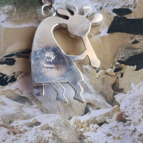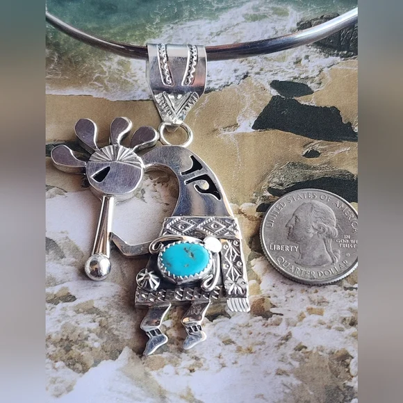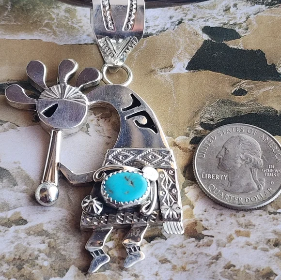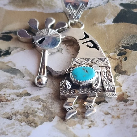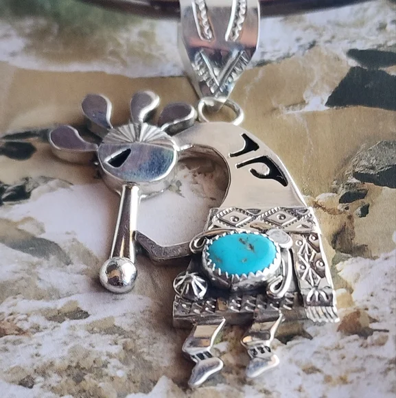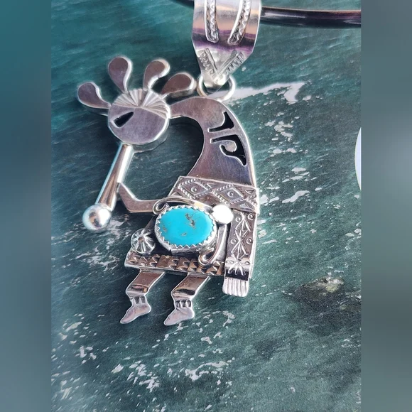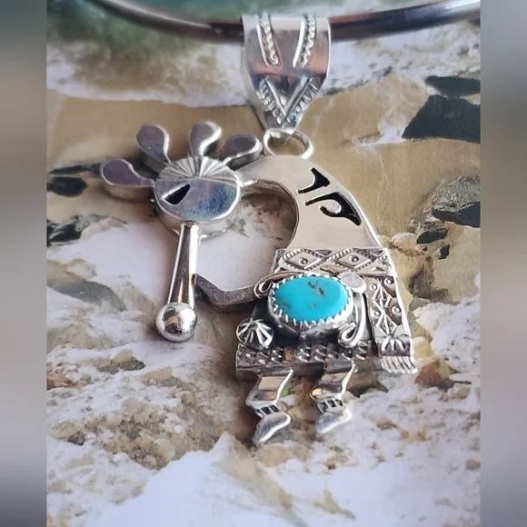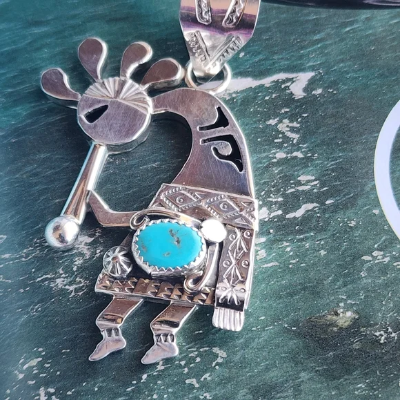 NATIVE MADE & SIGNED Silver and Turquoise Kokopelli Pendant