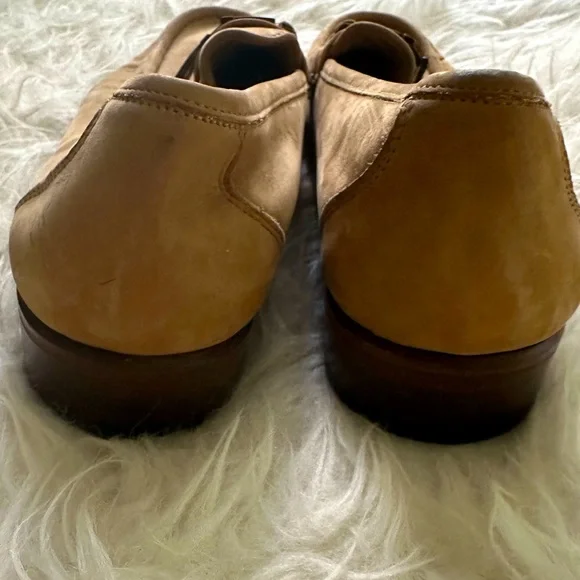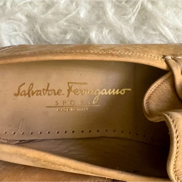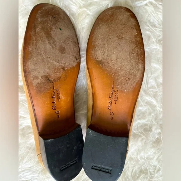 Tan Ferragamo loafer/moccasin in suede. Have the traditional and famous Gancini ornament. Size 10. Show signs of wear but have a lot of life left in them!