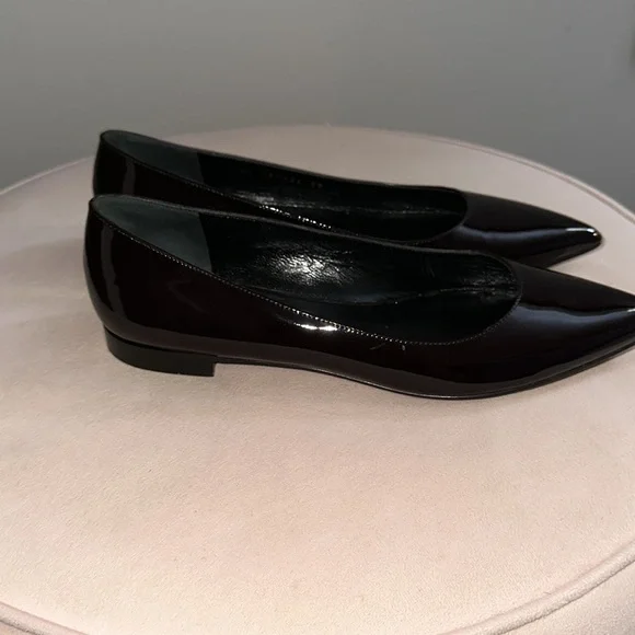 Brand new, never worn pointed toe Saint Laurent patent flats. Color is a deep burgundy. Very chic.