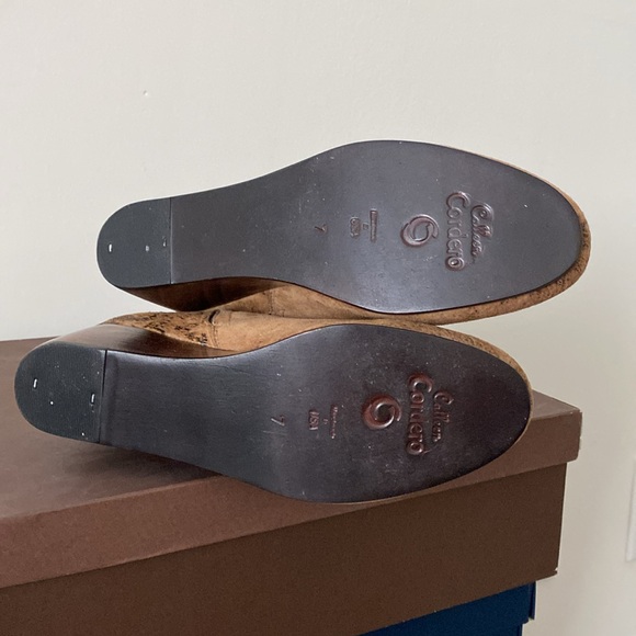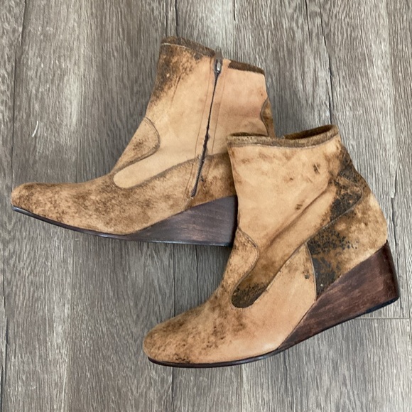 Handmade in Hollywood by prestigious shoe designer Calleen Cordero, these distressed suede booties feature a unique finish, 2 1/4" wooden wedges, inside zip closure, with a 5" shaft. Size 7, fits a 7 1/2, worn once, in original box.