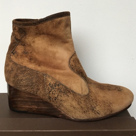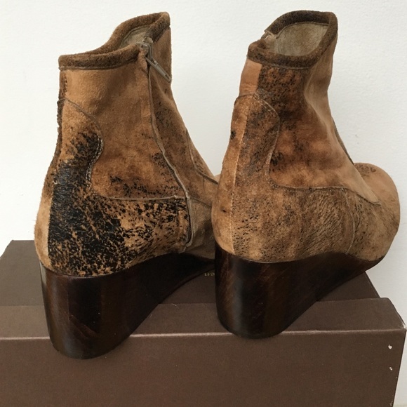 Handmade in Hollywood by prestigious shoe designer Calleen Cordero, these distressed suede booties feature a unique finish, 2 1/4" wooden wedges, inside zip closure, with a 5"...