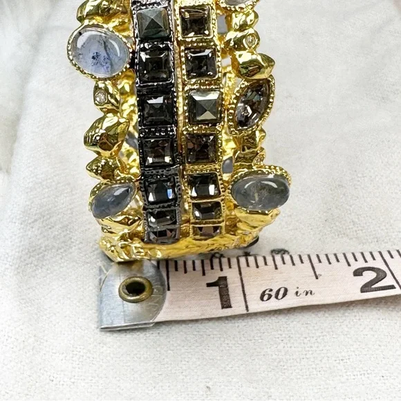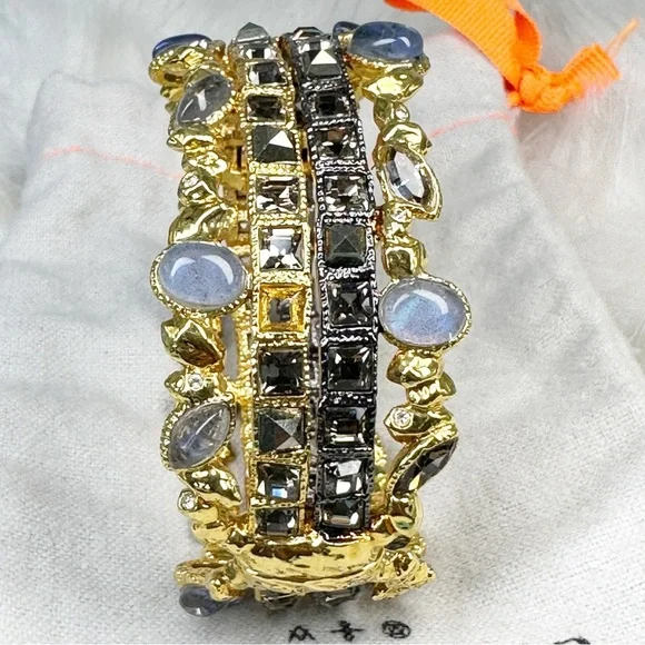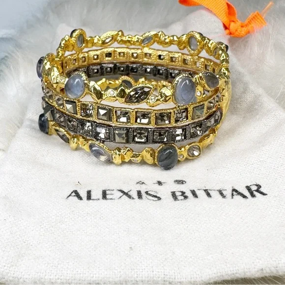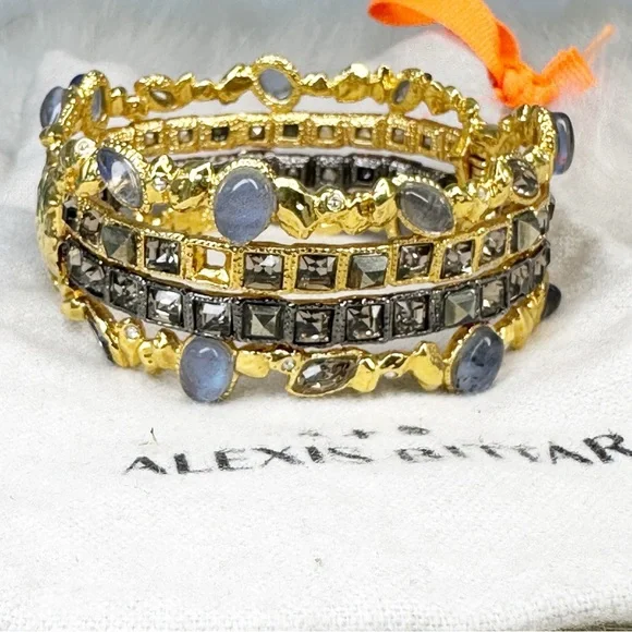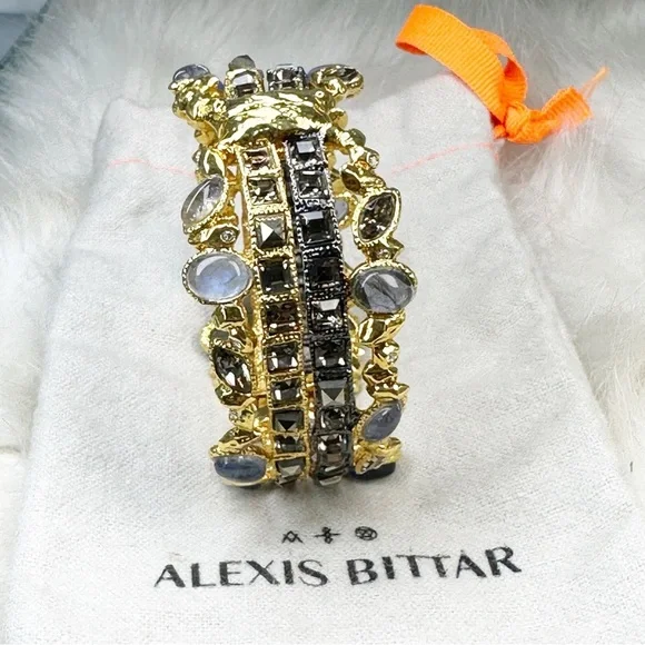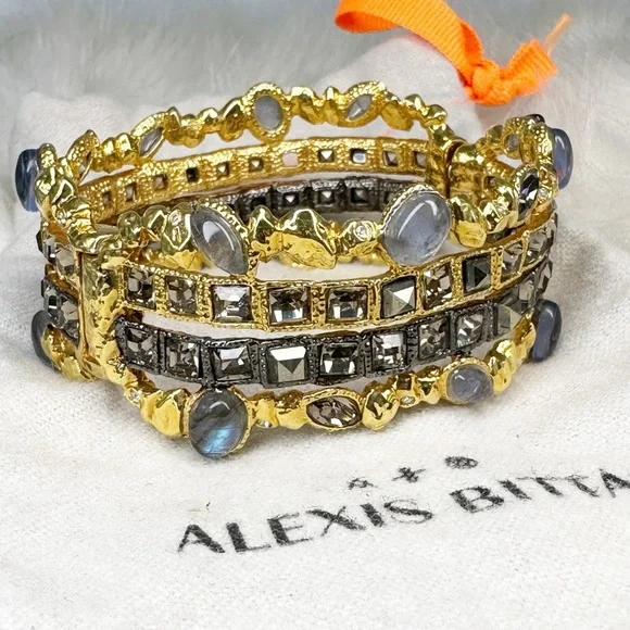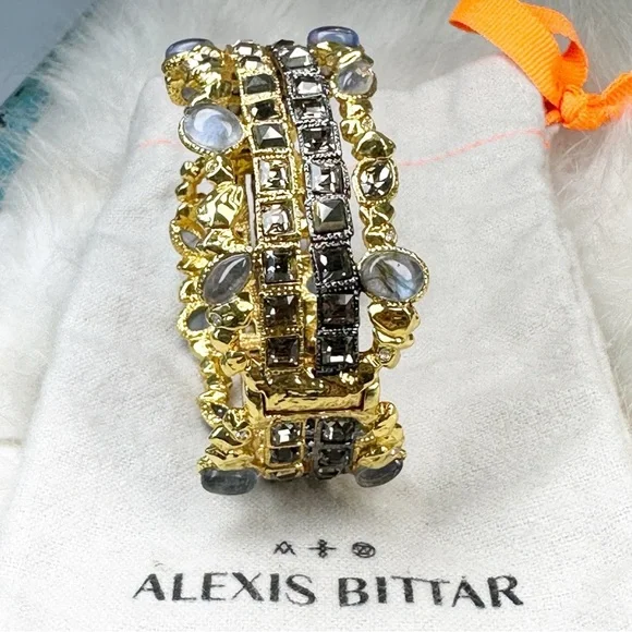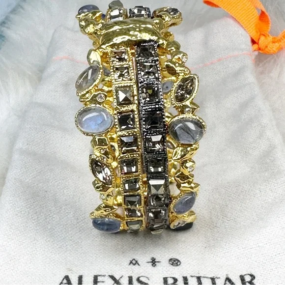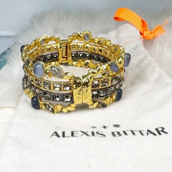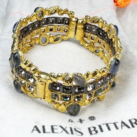Excellent pre-owned condition!Shiny and beautiful with all stones and crystals, EXCEPT ONE, Intact. MISSING ONE SQUARE CRYSTAL.Hard to findGorgeous!The labradorite stones are so beautiful and are very unique in color!Measures approximately 7" as measured on the INSIDE of the bracelet. Ships fast in a cute jewelry pouch and tin. Alexis Bittar Pouch is a photo prop and WILL NOT BE SENT.