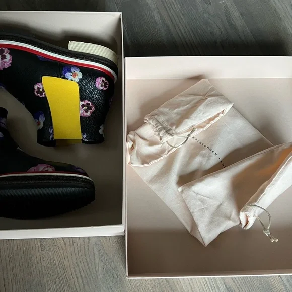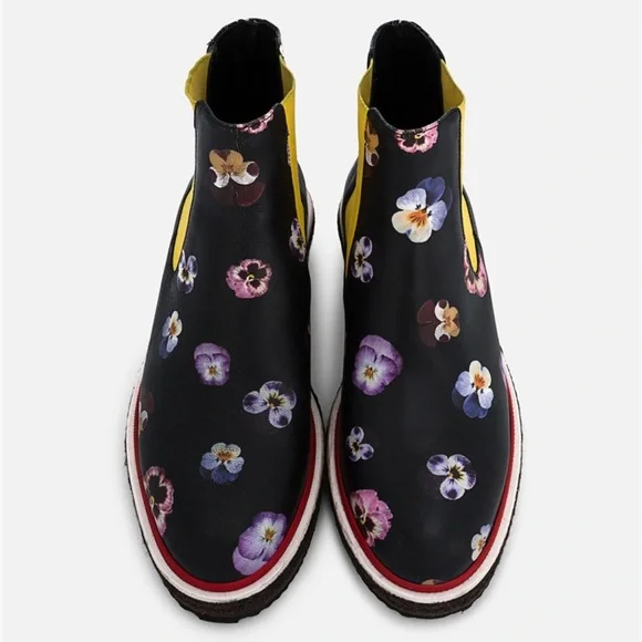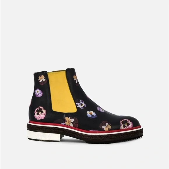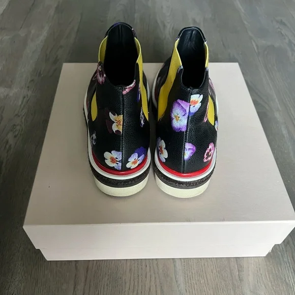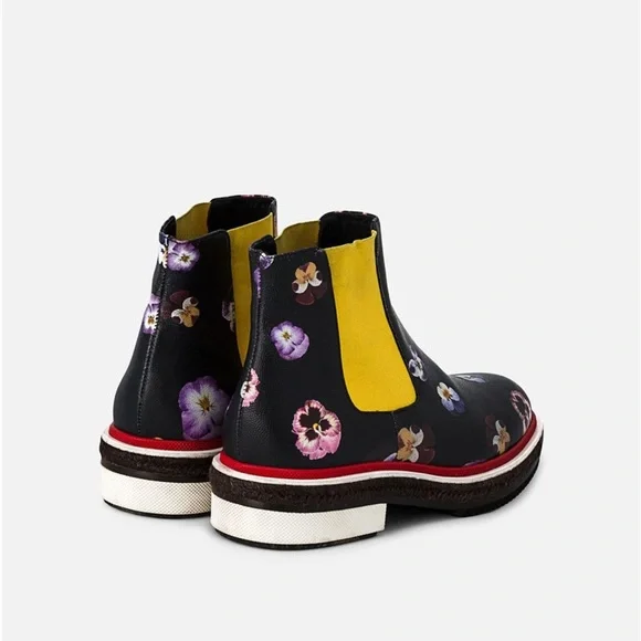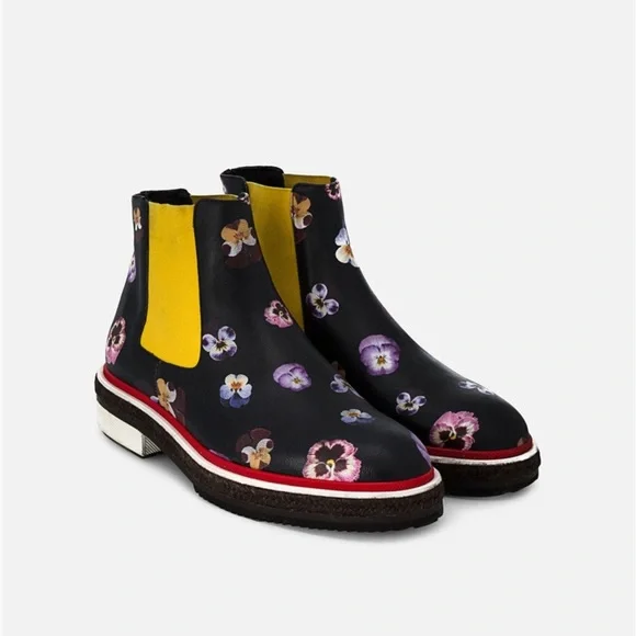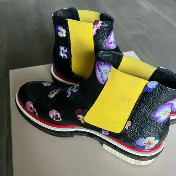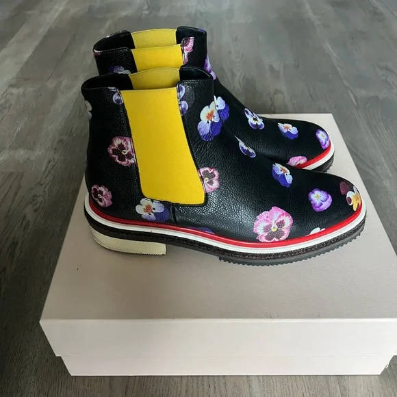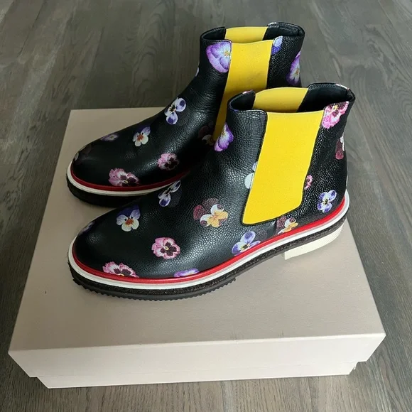 Digital Ditsy pansy printElasticated side panelsDiamond patterned red weltEspadrille-style mid sectionChunky rubber sole100% LeatherPurchased directly onlineMade in Italy SIZE: 40*very light rubbing on interior ankle elastic (see images)*worn only about 3 or 4 times (see images of soles)*smooth and showerproof making it a great optimistic boot for rainy days*comes with original box and dust bagMAKE AN OFFER