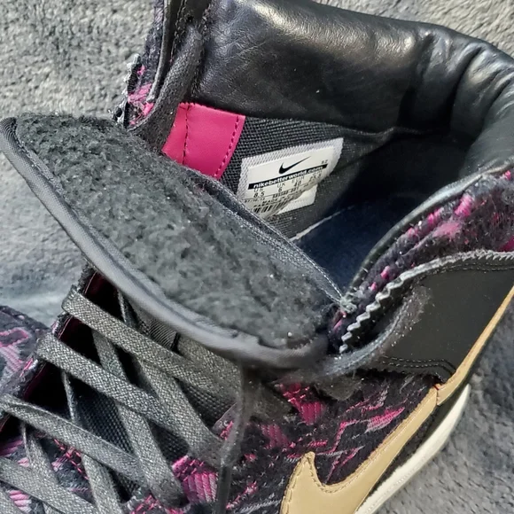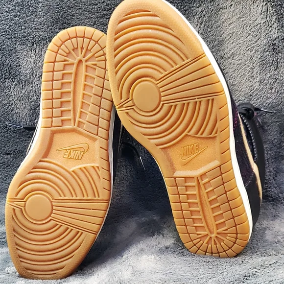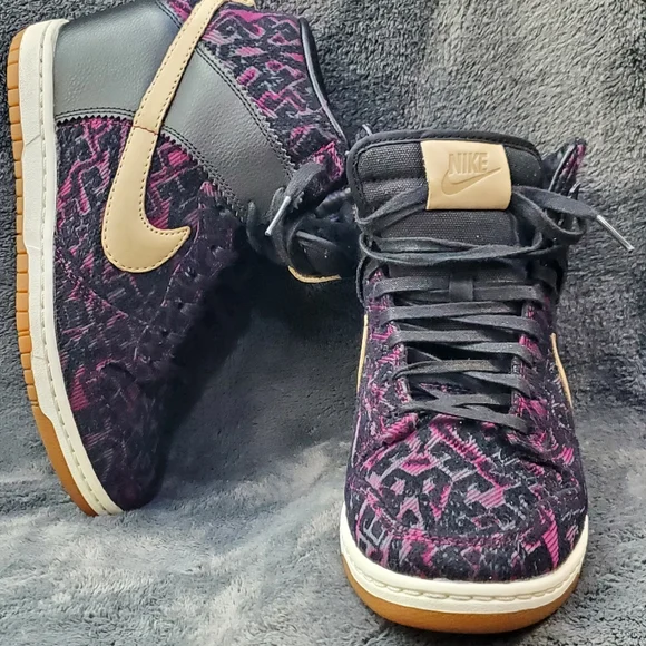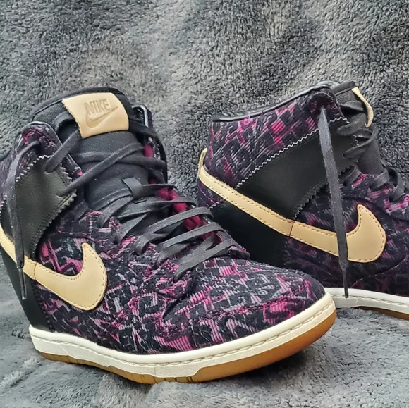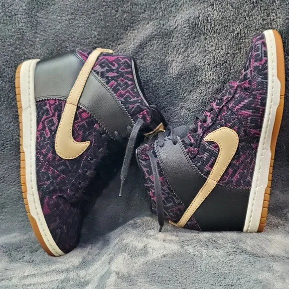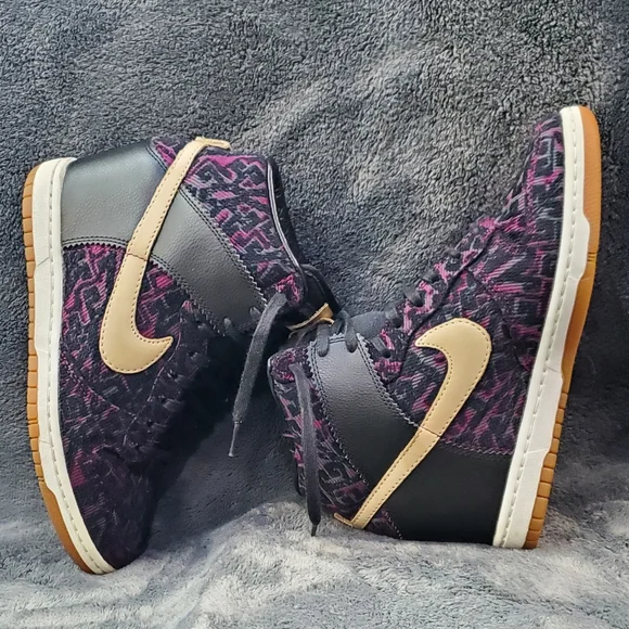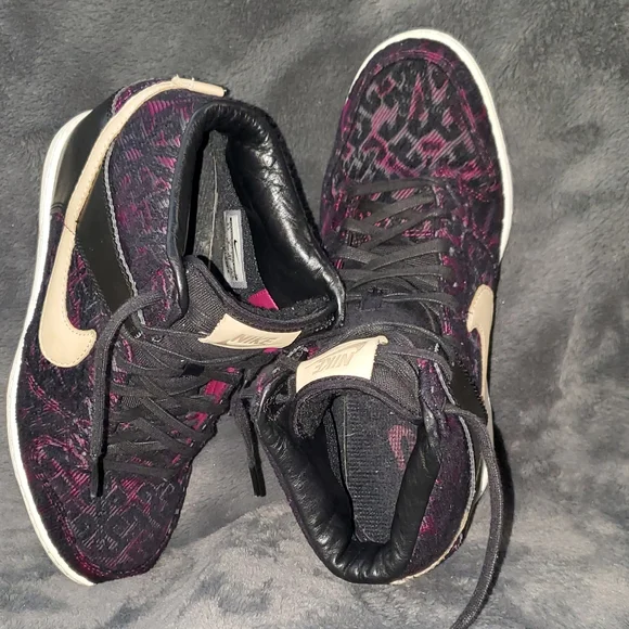 Nike WMNS “Purple Dynasty” Curtains Design Sky Hi Hidden wedge.Decorated with purple and black creative design fully fitted out with lavish leathers, decorative purple woven textile, tan leather accenting and black waxed lacing.Excellent Condition, Woman´s Size 8.5