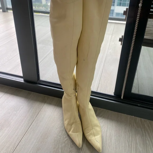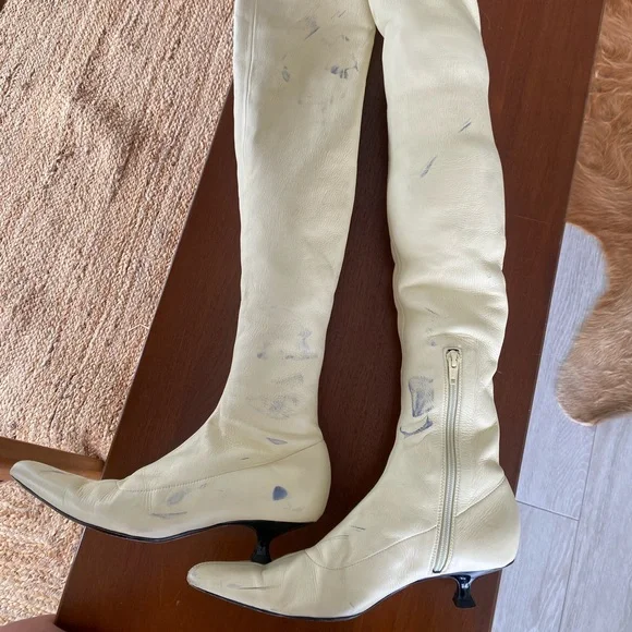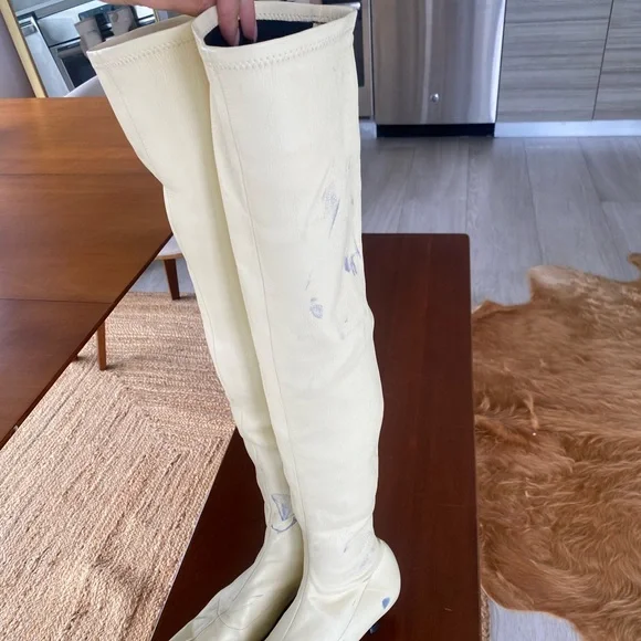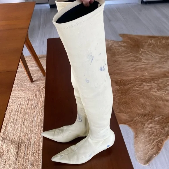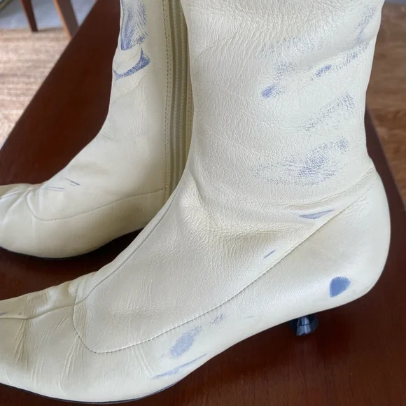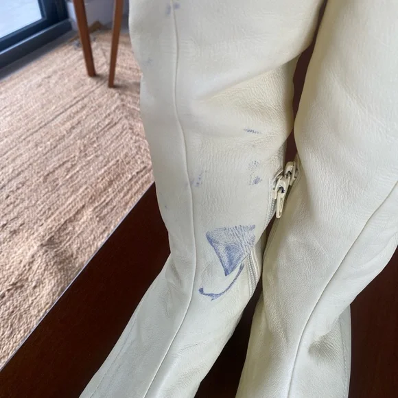 Unfortunately, these beautiful boots were storage in a box which cause damage. I believe with the right care and deep cleaning it might be removed or fade. Unfortunately I don´t have the time to do it so that´s why I dropped the price to 70% off. Besides that there are super comfy and chic. Also while on the feet you can fold them where the stains are too kind of hide the stains to be less noticeable.Khaite, Tony Bianco, high boots