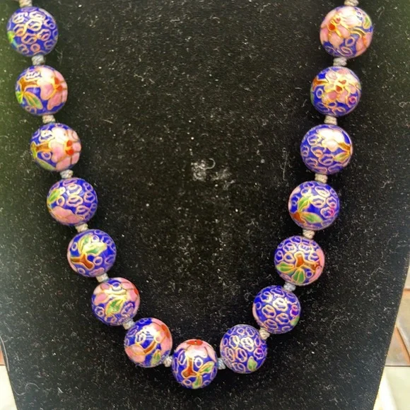 This elegant Asian inspired floral beaded necklace features a stunning combination of blueand gold pink and green beads. Hand knotted and made in India Perfect for adding a touch...