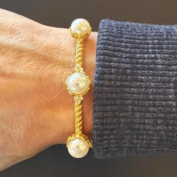 Judith Ripka Cuff Hinge Cuff BraceletThree 12mm Cultured Freshwater Pearls 0.20ctw CZ/Diamonique/Bella Luce (Diamond Simulant) 14k Yellow Gold Clad over sterling silverMeasures...
