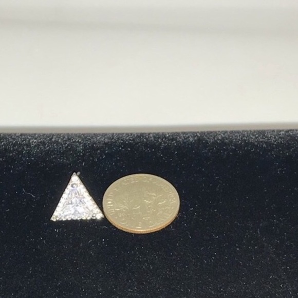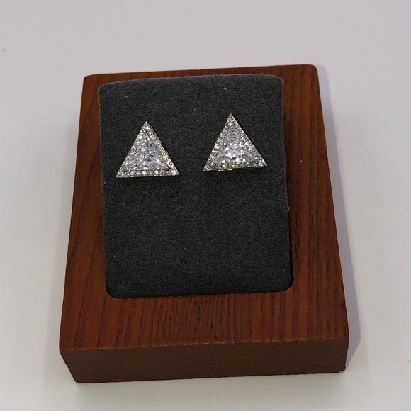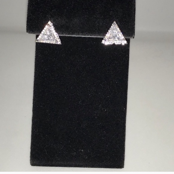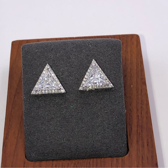 NewThe perfect touch of sparkle for any attire, these white zircon stud earrings go the fashion distance. Each timeless earring features a shimmering 1ctw trillion cut enhanced by a halo of pave solitaire stonesEach earring is 1ctwWhite gold plating over sterling silver, these will not tarnish, they are brilliantly buffed to a luster, the post backs secure comfortably with friction backs.1.1cm x1.2cm diameter No tradesOffers considered via the offer button