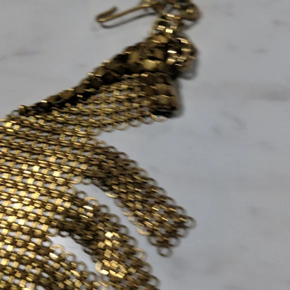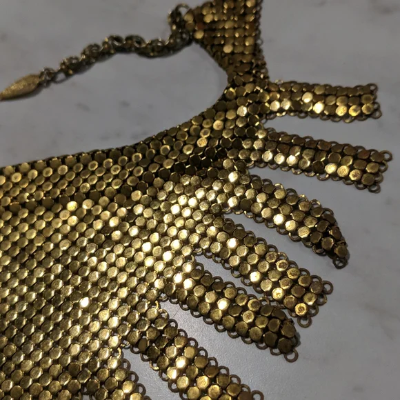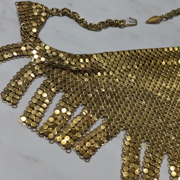 RARE STYLE FRINGE Whiting & Davis Vintage Gold Tone Mesh Fringe Bib Necklace.