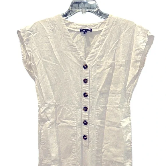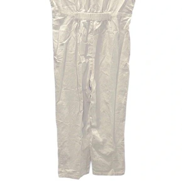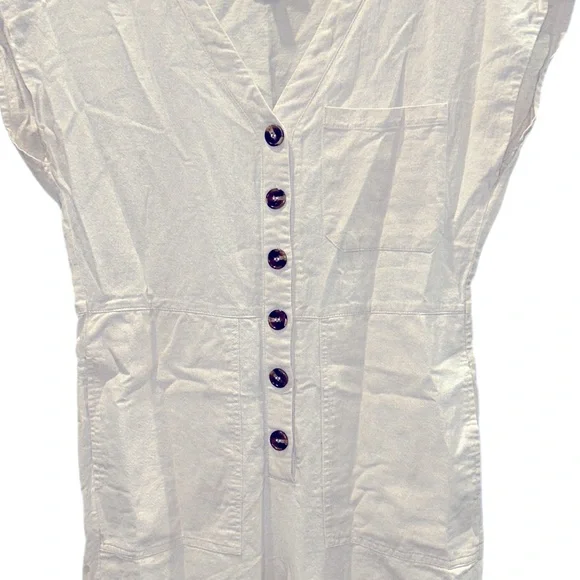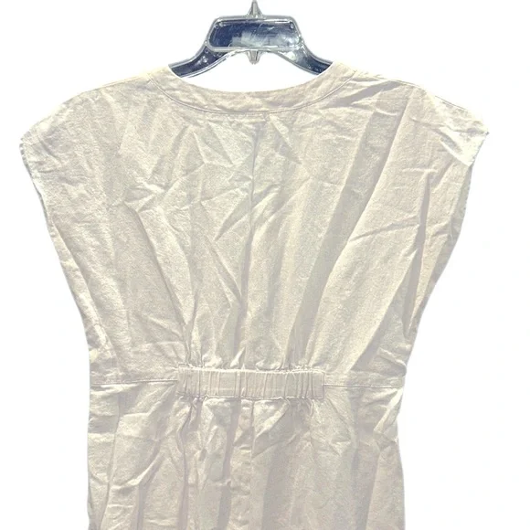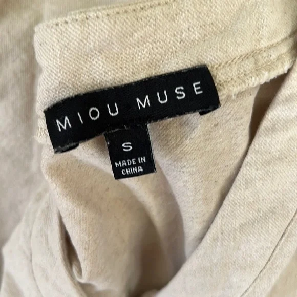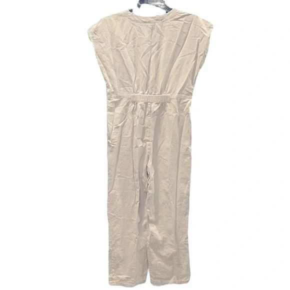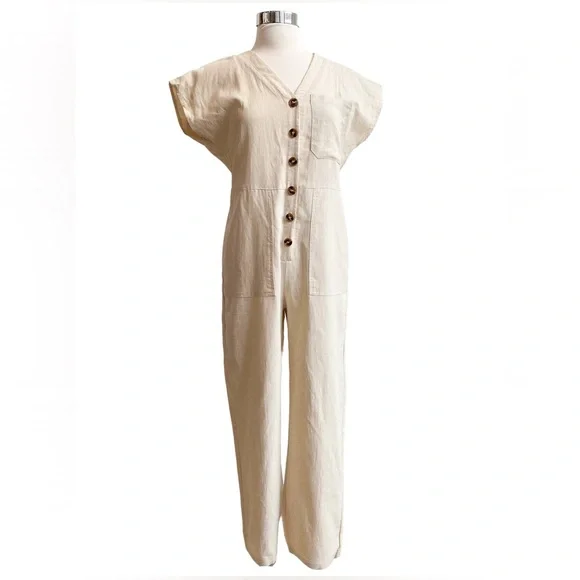 Adorable Miou Muse Button Front Linen Blend Jumpsuit in Oatmeal Light creamy tanTortoise brown Buttons down the front Cap sleeves V-NeckPatch pocket on one side of chest Side patch pocketsElastic on center back waistCotton and linen blend In excellent gently worn condition Size SmallApproximate Measurements Laying Flat:Bust pit to pit - 19”Waist - 16” across front Inseam - 24.5”Total length - 50”