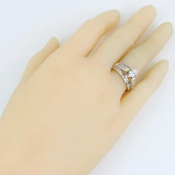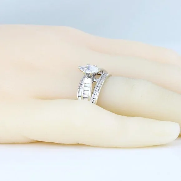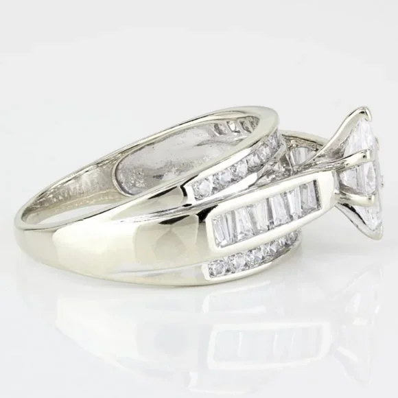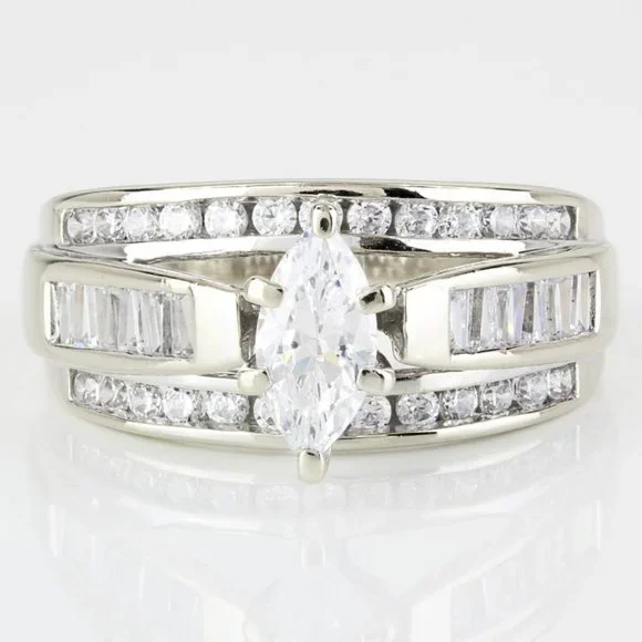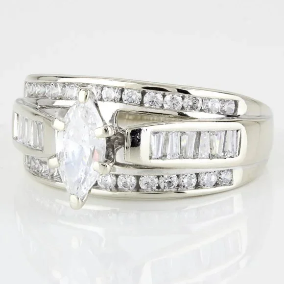 This engagement ring is made of 10 karat white gold and features a marquise-cut cubic zirconia stone accompanied by an assortment of 12 tapered baguette CZs (2mm x 1mm) & 13...