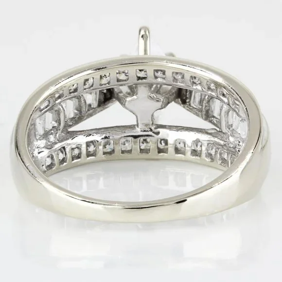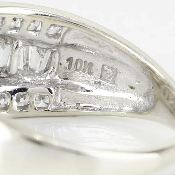 This engagement ring is made of 10 karat white gold and features a marquise-cut cubic zirconia stone accompanied by an assortment of 12 tapered baguette CZs (2mm x 1mm) & 13 round-cut CZs (1mm). The band is a size 7 and has "10K" and a hallmark stamped onto the inner side of it. Size: 7Weight: 2.43dwt/3.78gMetal: 10 karat white goldGemstones: 26 Cubic Zirconia stones, Center stone: (8mm x 4mm) 830092-1*e-rrx