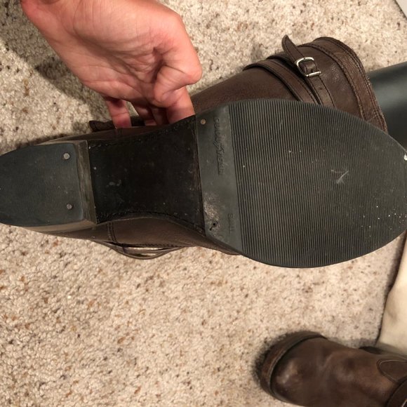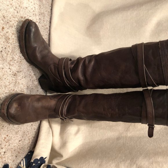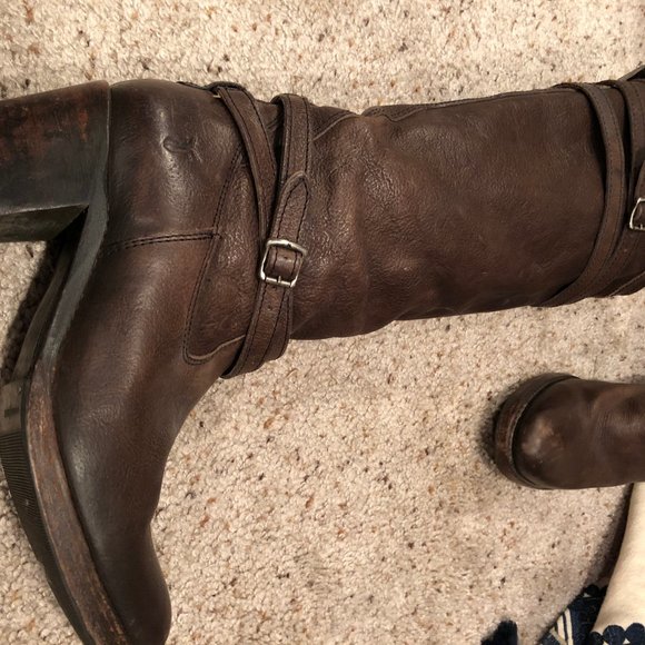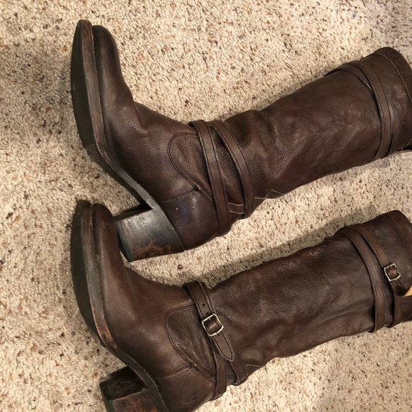 Original Leather Frye Boots with heel. Accent buckles around the ankle and calf. Worn a handful of times and still in great shape. Weatherized with rubber added soles to protect the sole from wear and tear.