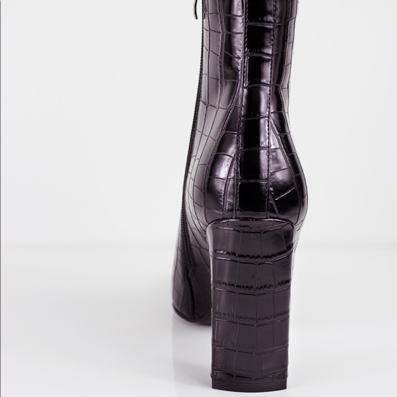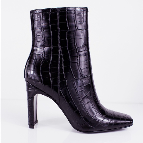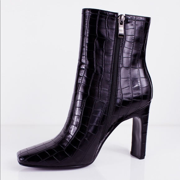 Our DRACO booties are a special pair. It has a square toe shape, a slim rectangle heel and a vegan exotic leather wrapping. It has a soft velvet inside to keep your feet warm and cosy in winter.Runs true to sizeHeel Height: 4.2 "Designed in Los Angeles. Ethically made in China.