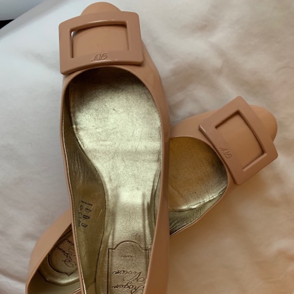 I am selling my Roger Vivier Nude Leather Gommette Ballerina Flats Size 39 With Box. This is an authentic Roger Vivier Gommette ballerina, bought in Bergdorf Goodman in NYC. Iconic patent Buckle with RV initials engraved.The shoes condition is pre-owned, but I only wore it a couple of times. Overall wonderful pre owned condition and well taken care of.Feel free to ask questions!
