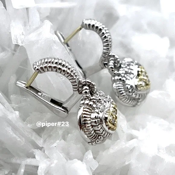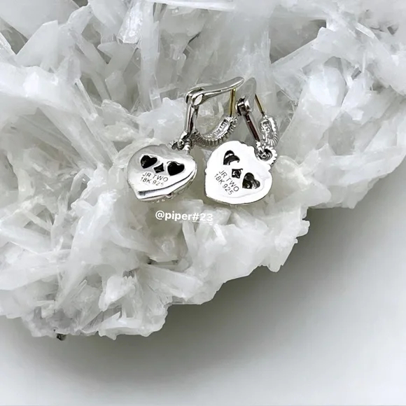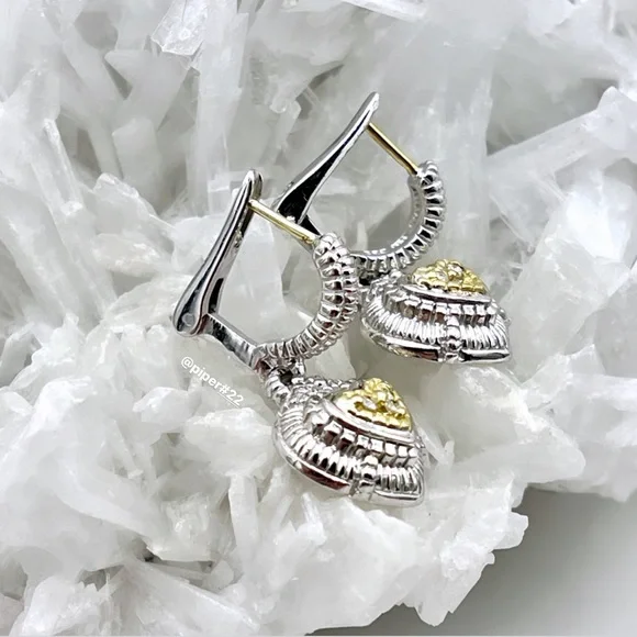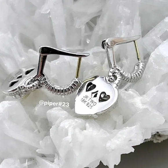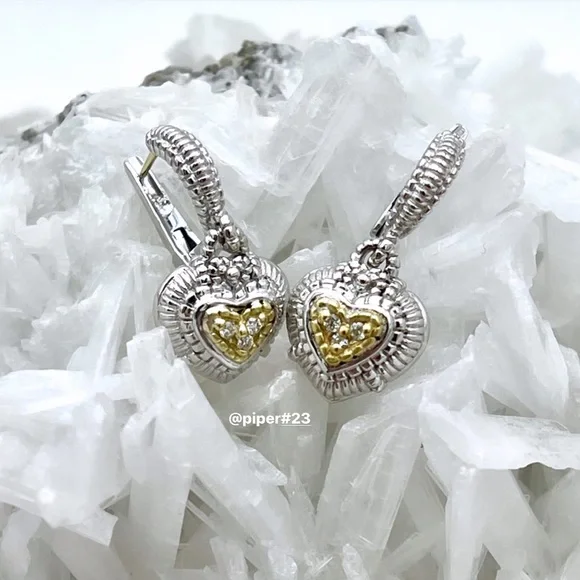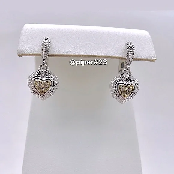 Judith Ripka Sterling Silver 18K Gold JR TWO Diamond Heart Romance Drop Earrings